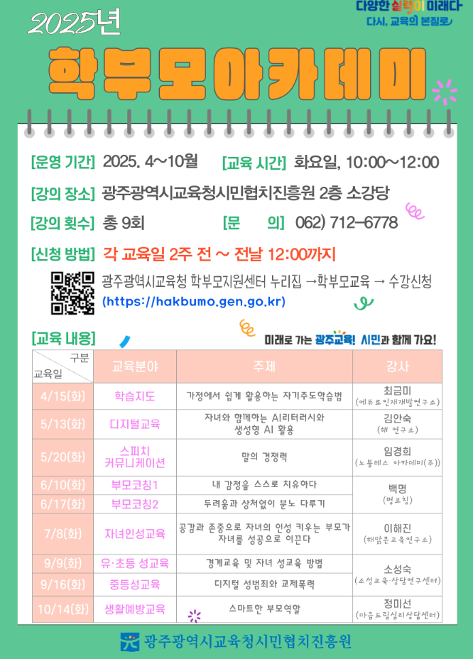 home 맘편한 내★일, 광주아이키움2.0 결혼·임신·출생 영유아 초·중·고 다양한 가족 일생활균형 커뮤니티 아동돌봄지원 소통방 나눔방 광주 아이키움 상담방 돌봄정보방 성폭력 피해 상담 및 사건지원 공지사항 우리동네 돌봄정보 기관별 공지사항 2025년 학부모 아카데미 수강 안내 등록일 : 2025-03-18 15:10 카테고리 : 카테고리 없음 작성자 : 운영자 조회수 : 150 2025년 학부모 아카데미 수강안내[운영기간] 2025. 4~10월[교육시간] 화요일, 10:00~12:00[강의장소] 광주광역시교육청 시민협치진흥원 2층 소강당[강의횟수] 총9회[문 의] 062)712-6778[신청방법] 각 교육일 2주 전~전날 12:00까지 광주광역시교육청 학부모지원센터 누리집>학부모교육>수강신청<출처 : 광주광역시교육청 학부모지원센터> 목록