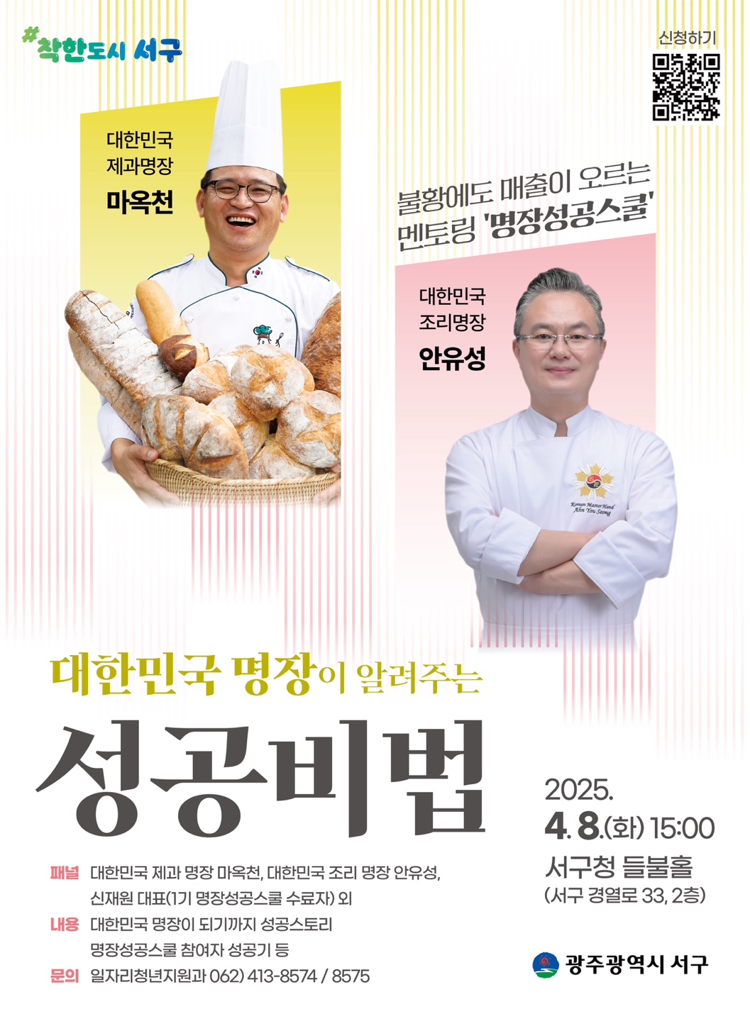 home 맘편한 내★일, 광주아이키움2.0 결혼·임신·출생 영유아 초·중·고 다양한 가족 일생활균형 커뮤니티 아동돌봄지원 소통방 나눔방 광주 아이키움 상담방 돌봄정보방 성폭력 피해 상담 및 사건지원 공지사항 우리동네 돌봄정보 기관별 공지사항 [무료강의] '명장성공스쿨' 명장 마스터 토크쇼 등록일 : 2025-04-01 14:08 카테고리 : 카테고리 없음 작성자 : 운영자 조회수 : 156 흑백 요리사 안유성 명장, 동네 빵집의 신화 베비에르 마옥천 명장두 명의 대한민국 명장이 알려주는 불황에도 성장하는 성공비법 토크 콘서트!바로 신청하세요.○ 교육명 : 서구청 명장 마스터 토크쇼 ○ 장 소 : 서구청 들불홀(서구 경열로 33, 2층)○ 일 정 : 25.04.08(화) 15:00 ~ 16:30○ 모집인원 : 70명 (접수중)○ 문 의 : 062)413-8574, 8575, 8581 목록
