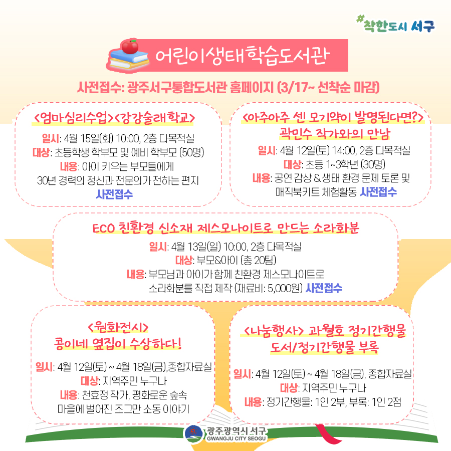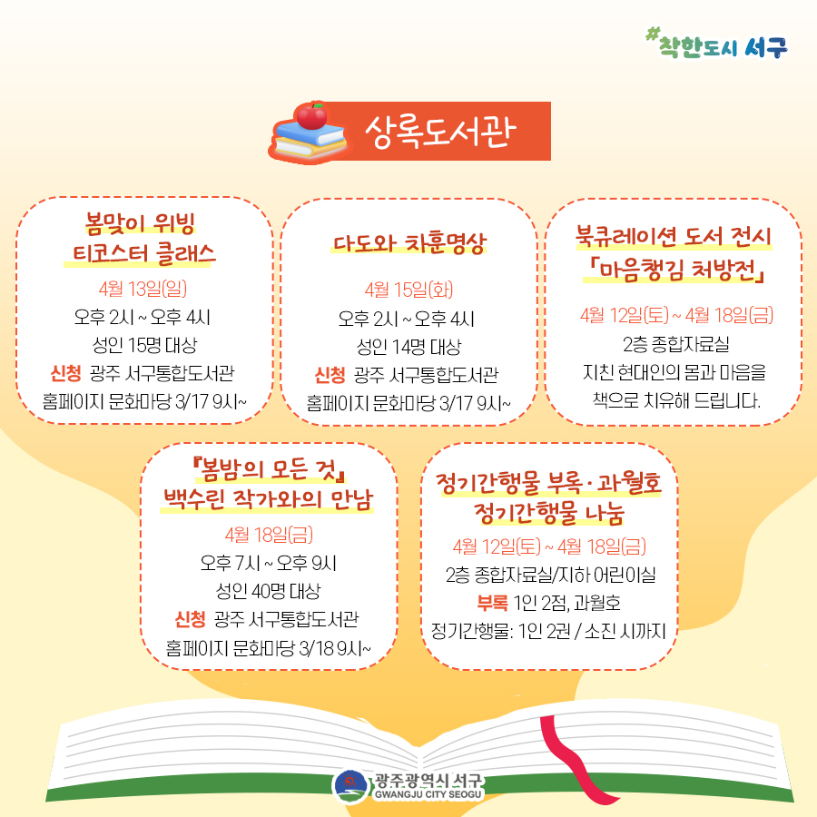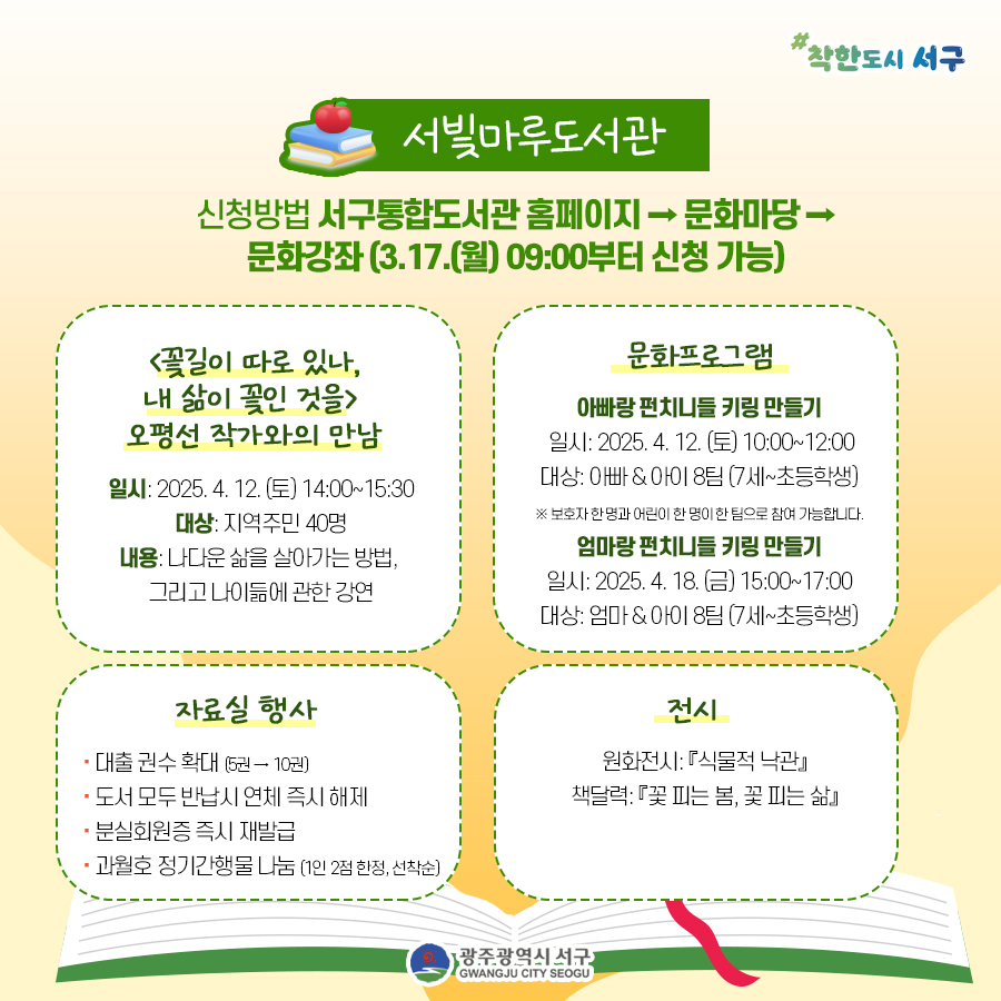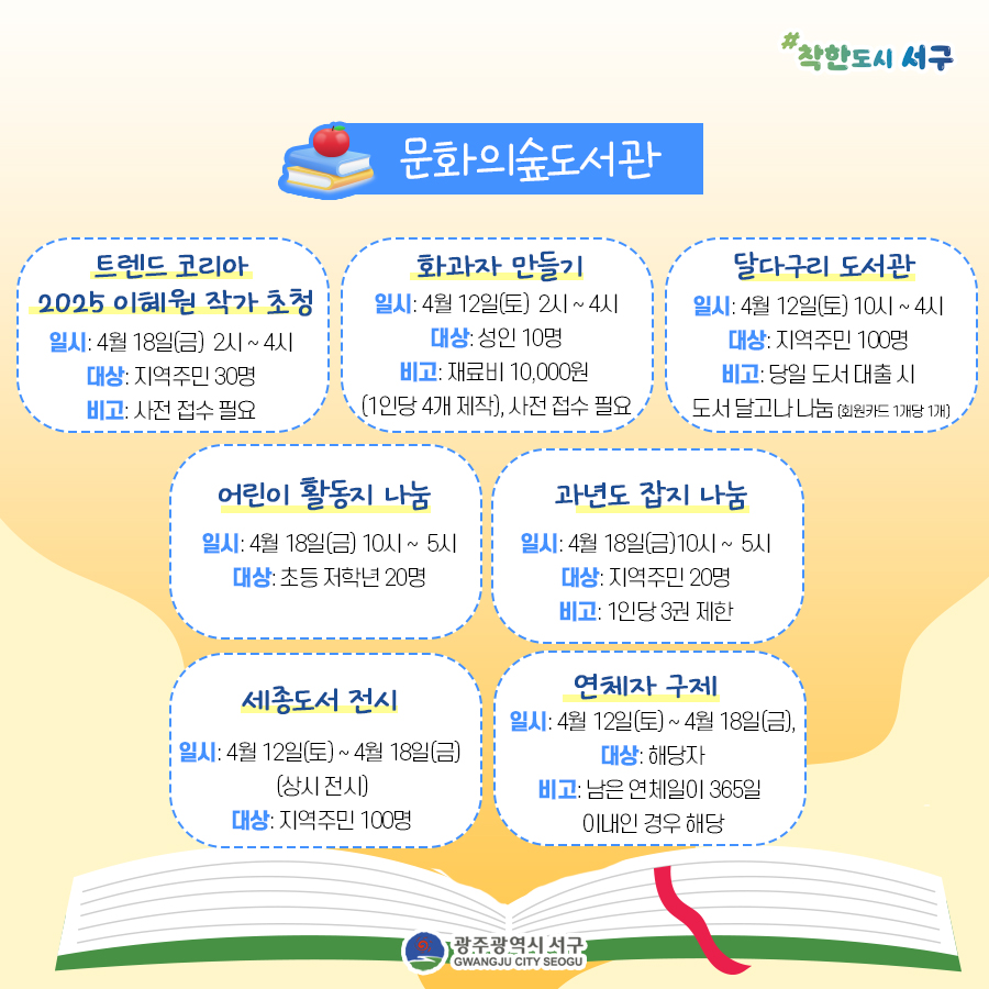 home 맘편한 내★일, 광주아이키움2.0 결혼·임신·출생 영유아 초·중·고 다양한 가족 일생활균형 커뮤니티 아동돌봄지원 소통방 나눔방 광주 아이키움 상담방 돌봄정보방 성폭력 피해 상담 및 사건지원 공지사항 우리동네 돌봄정보 기관별 공지사항 [서구 구립도서관] 🏫2025 4월 3주차 주간행사 등록일 : 2025-04-15 14:26 카테고리 : 카테고리 없음 작성자 : 운영자 조회수 : 126 첨부파일 도서관 주간행사.jpg 다운로드 2025 서구 구립도서관 도서관 주간 행사 (25.4.12 ~ 25.4.18)[출처: 광주광역시 서구청] 목록