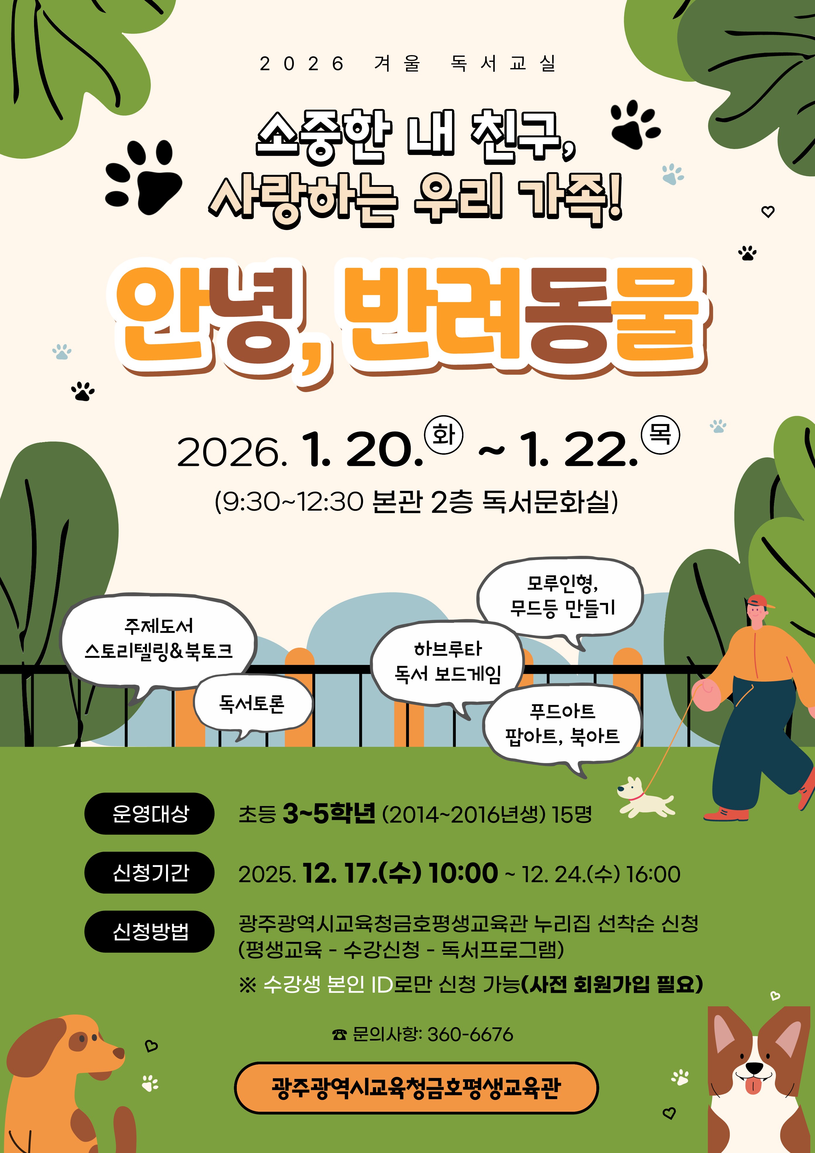 home 맘편한 내★일, 광주아이키움2.0 결혼·임신·출생 영유아 초·중·고 다양한 가족 일생활균형 커뮤니티 아동돌봄지원 소통방 나눔방 광주 아이키움 상담방 돌봄정보방 성폭력 피해 상담 및 사건지원 공지사항 우리동네 돌봄정보 기관별 공지사항 [광주교육청금호평생교육관]2026년 겨울 독서교실 '안녕, 반려동물' 등록일 : 2025-12-16 14:16 카테고리 : 카테고리 없음 작성자 : 운영자 조회수 : 73 2026년 겨울 독서교실 '안녕, 반려동물' 수강생을 모집하오니, 많은 참여 바랍니다. 출처:광주광역시교육청금호평생교육관 목록