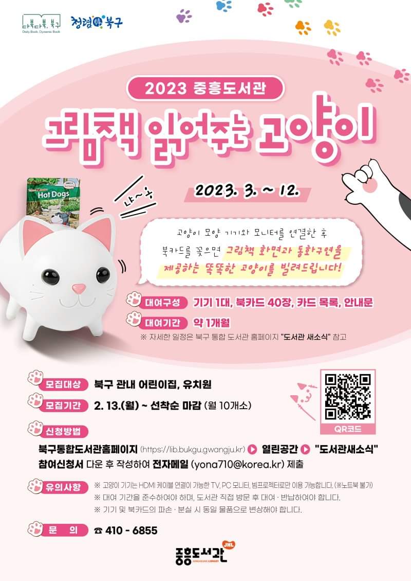 북구 중흥도서관에서는 영유아에게 그림책 읽기의 새로운 경험을 제공하고 독서에 대한 흥미 고취를 위해 그림책 읽어주는 고양이를 운영합니다!💗
