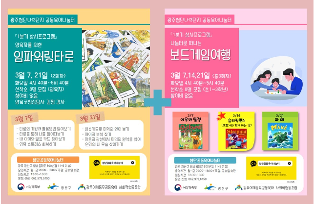 home 맘편한 내★일, 광주아이키움2.0 결혼·임신·출생 영유아 초·중·고 다양한 가족 일생활균형 커뮤니티 아동돌봄지원 소통방 나눔방 광주 아이키움 상담방 돌봄정보방 성폭력 피해 상담 및 사건지원 공지사항 우리동네 돌봄정보 기관별 공지사항 첨단 공동육아나눔터에서 가족프로그램을 신청 등록일 : 2023-03-07 14:31 카테고리 : 카테고리 없음 작성자 : 운영자 조회수 : 418 첨단 공동육아나눔터에서 가족프로그램을 신청받고 있습니다. 2차시- 임파워링타로(양육자 대상) / 3차시- 보드게임(자녀+양육자)1+1 가족프로그램 2탄 신청하기 ▶▶▶https://forms.gle/w9yqVTvRGbuUBVdM9 목록