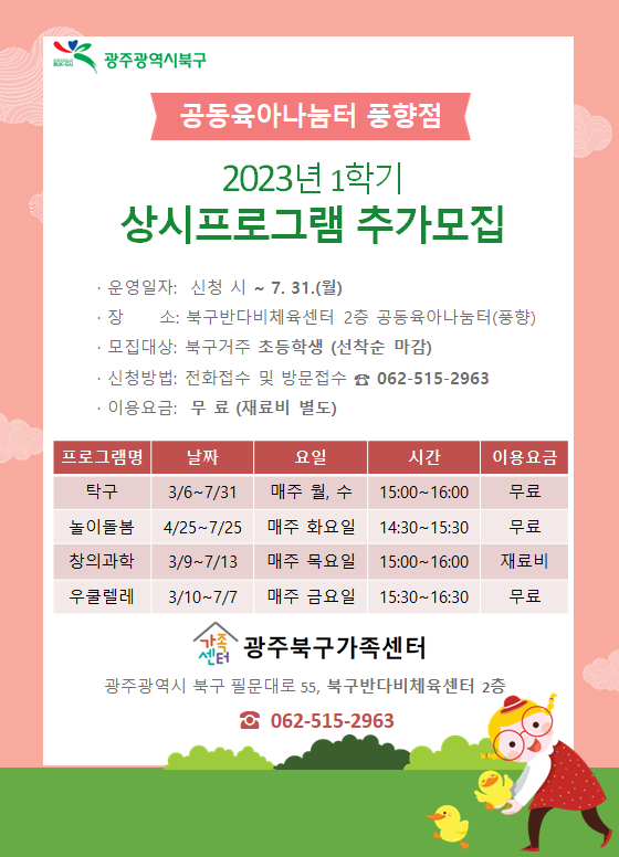 home 맘편한 내★일, 광주아이키움2.0 결혼·임신·출생 영유아 초·중·고 다양한 가족 일생활균형 커뮤니티 아동돌봄지원 소통방 나눔방 광주 아이키움 상담방 돌봄정보방 성폭력 피해 상담 및 사건지원 공지사항 우리동네 돌봄정보 기관별 공지사항 [북구육아나눔터 풍향점] 상시프로그램 추가모집 안내 등록일 : 2023-06-19 17:43 카테고리 : 카테고리 없음 작성자 : 운영자 조회수 : 319 북구 공동육아나눔터 풍향점에서는 2023년 1학기 상시프로그램 신청자를 모집하고 있습니다. 많은 관심과 참여 부탁드립니다. ○ 대상 : 북구 거주 초등학생○ 운영일자 : 신청시 ~ 7. 31.○ 장소 : 북구 반다비센터 2층, 공동육아나눔터○ 이용요금 : 무료 (재료비 별도)○ 신청방법 : 전화접수 및 방문접수 (062-515-2963) 목록