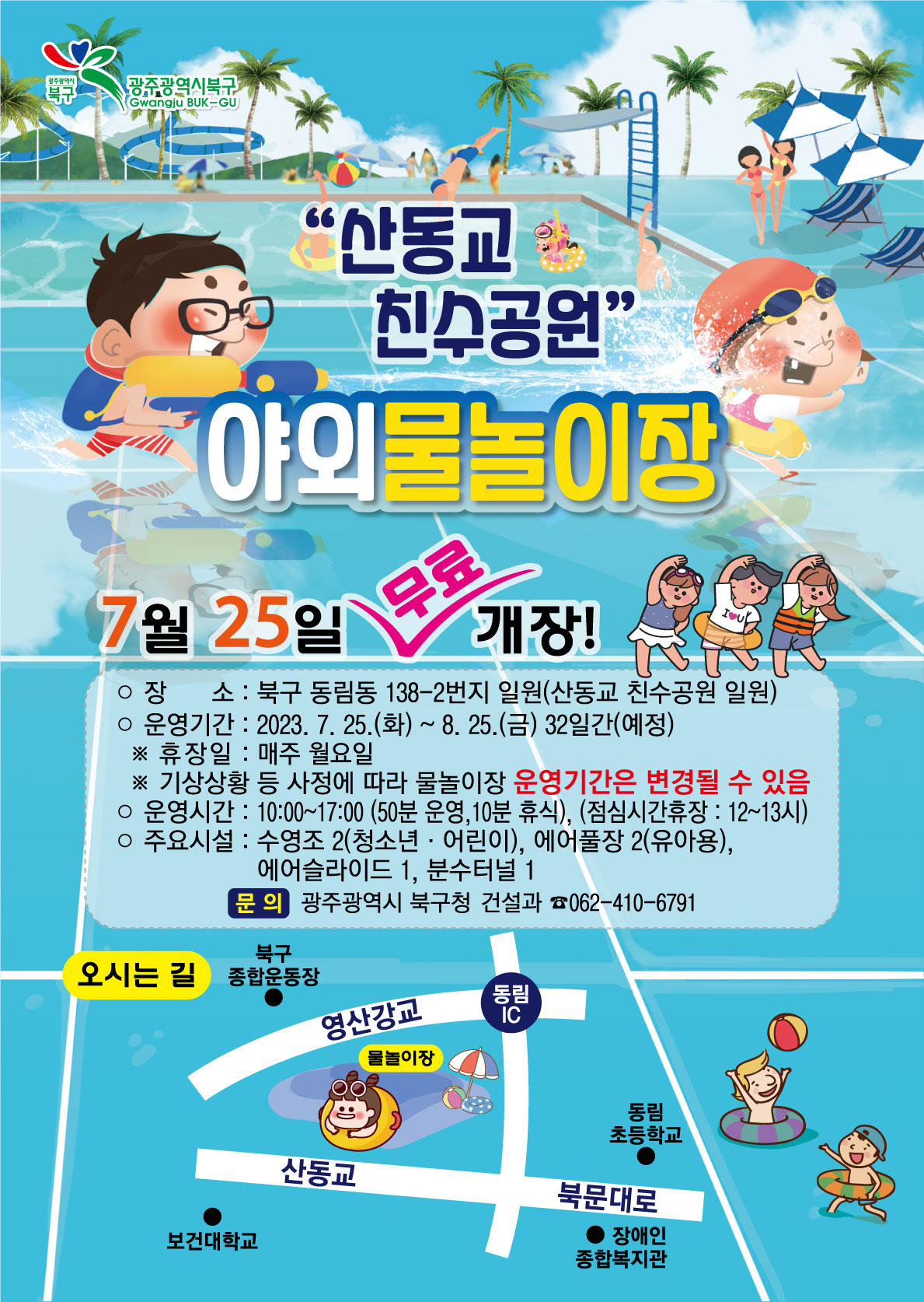 "산동교 친수공원" 야외 물놀이장이 7월 25일부터 무료 개장하오니 주민 여러분의 많은 이용 바랍니다.