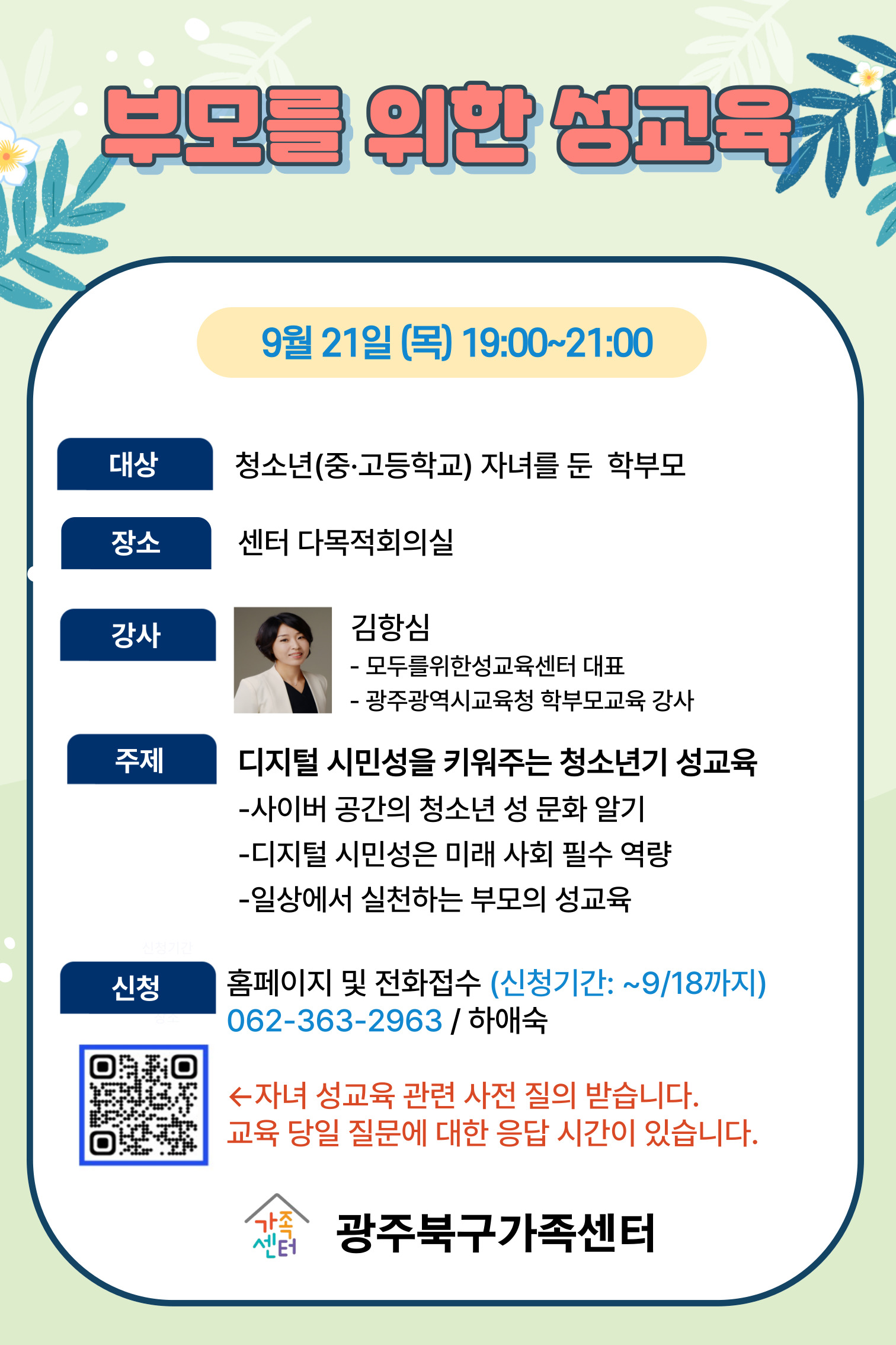 home 맘편한 내★일, 광주아이키움2.0 결혼·임신·출생 영유아 초·중·고 다양한 가족 일생활균형 커뮤니티 아동돌봄지원 소통방 나눔방 광주 아이키움 상담방 돌봄정보방 성폭력 피해 상담 및 사건지원 공지사항 우리동네 돌봄정보 기관별 공지사항 부모를 위한 성교육(청소년기 자녀) 등록일 : 2023-09-13 10:47 카테고리 : 카테고리 없음 작성자 : 북구가족센터 조회수 : 371 신청: 광주북구가족센터 홈페이지 목록