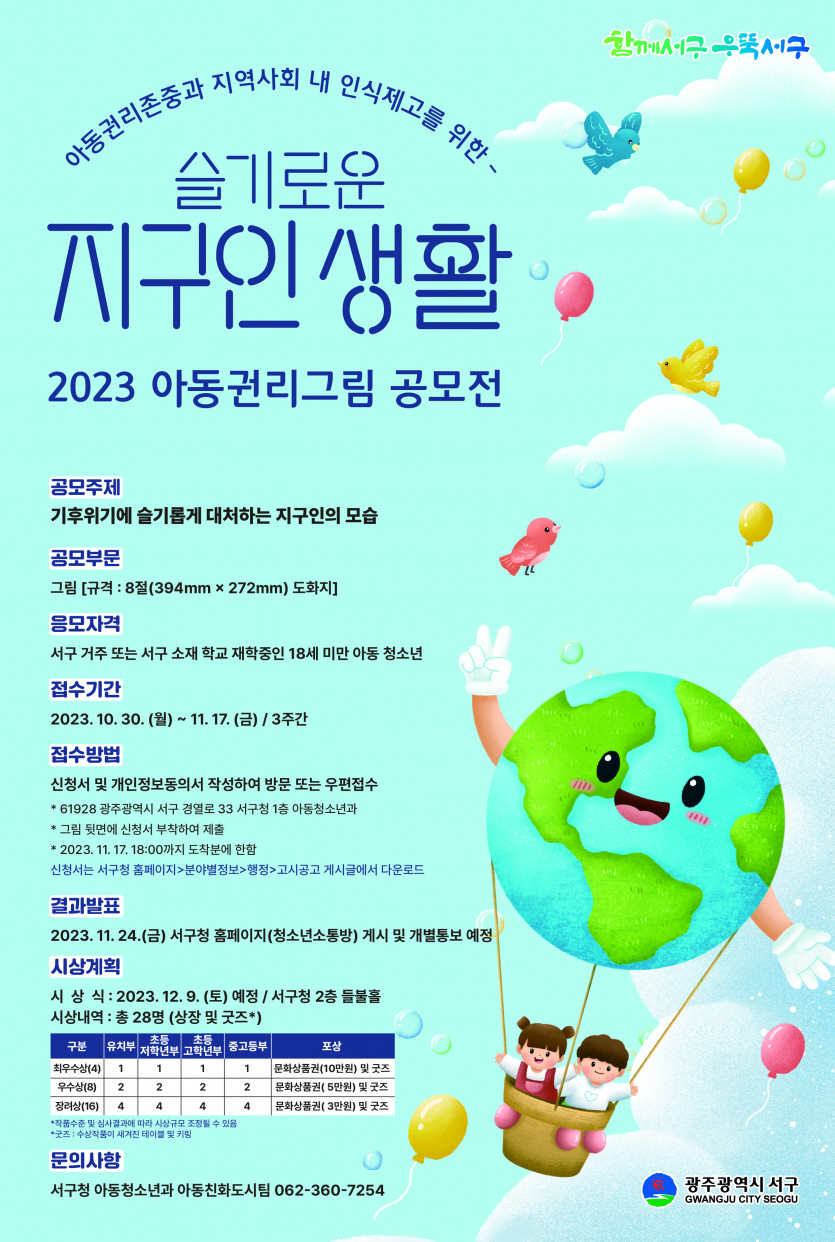 아동들이 기후위기 변화를 인지하고 기후위기로부터 안전한 생활과 적응에 대해 고민함은 물론 아동권리가 존중받는‘아동친화도시 광주 서구’의 가치를 구현하고자 2023년 아동권리그림 공모전을 개최하오니 많은 참여 바랍니다.