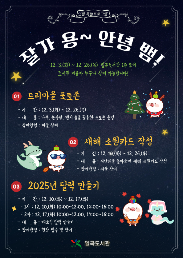 일곡도서관에서는 연말 특별프로그램으로 '잘가 용~ 안녕 뱀!' 프로그램을 진행중입니다.