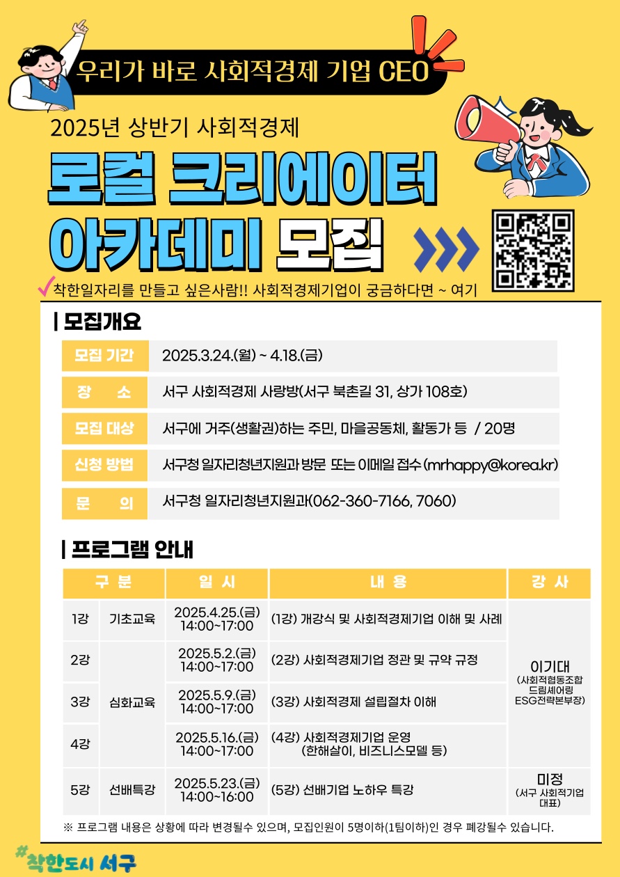 「2025년 상반기 서구 사회적경제 로컬크리에이터 아카데미」 참여자를 아래와 같이 모집하오니, 많은 참여 바랍니다.