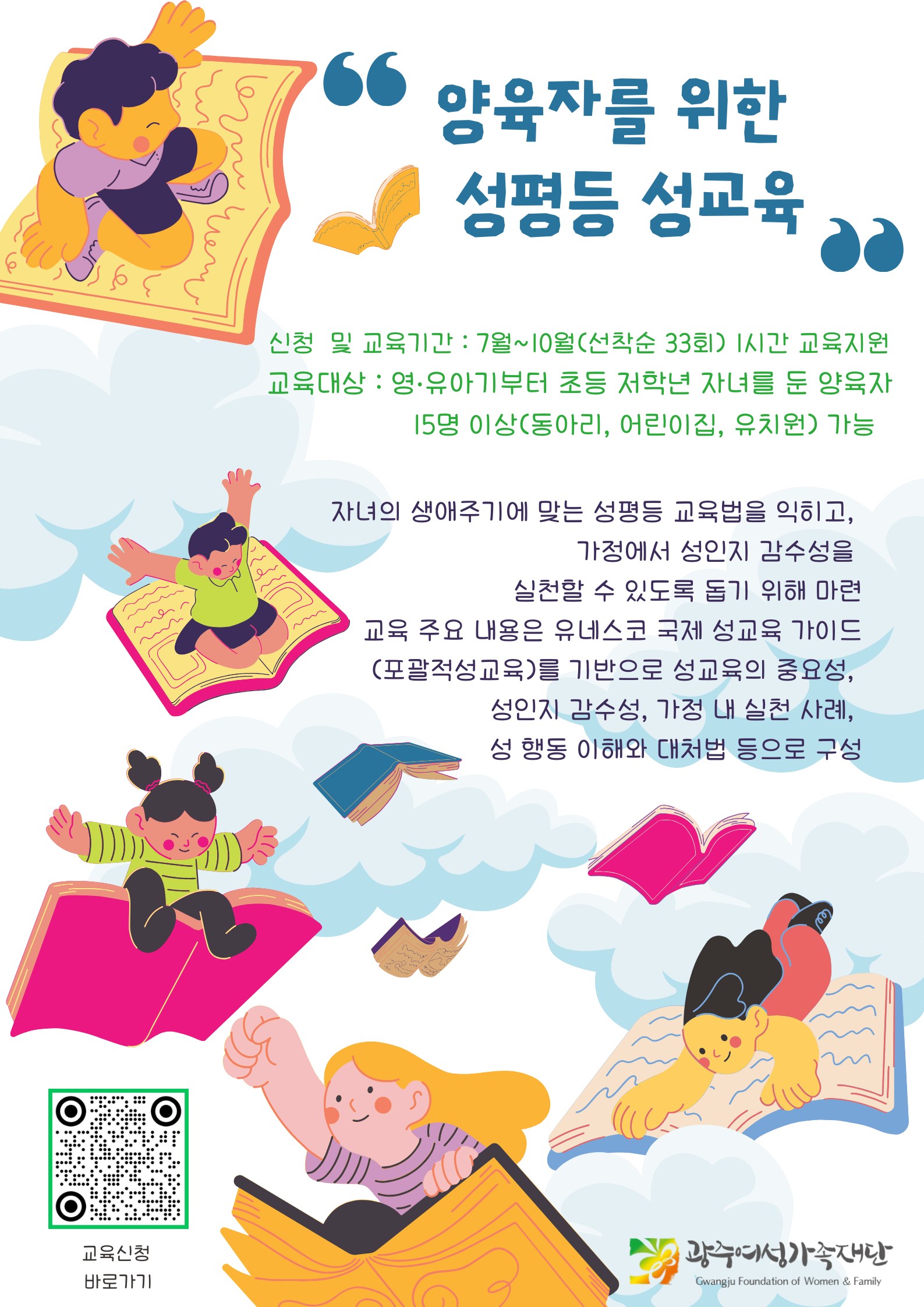 home 맘편한 내★일, 광주아이키움2.0 결혼·임신·출생 영유아 초·중·고 다양한 가족 일생활균형 커뮤니티 아동돌봄지원 소통방 나눔방 광주 아이키움 상담방 돌봄정보방 성폭력 피해 상담 및 사건지원 공지사항 우리동네 돌봄정보 기관별 공지사항 [교육모집] '양육자를 위한 성평등 교육' 안내📣 등록일 : 2025-07-07 13:25 카테고리 : 카테고리 없음 작성자 : 운영자 조회수 : 86 ○ 신청 및 교육기간 : 7월 ~ 10월 (선착순 33회) ○ 교육시간 : 1시간 ○ 교육대상 : 영유아기부터 초등 저학년 자녀를 둔 양육자 15명 이상 가능○ 신청방법 : 교육신청 하기 ○ 기타문의 : 062-670-0533 목록