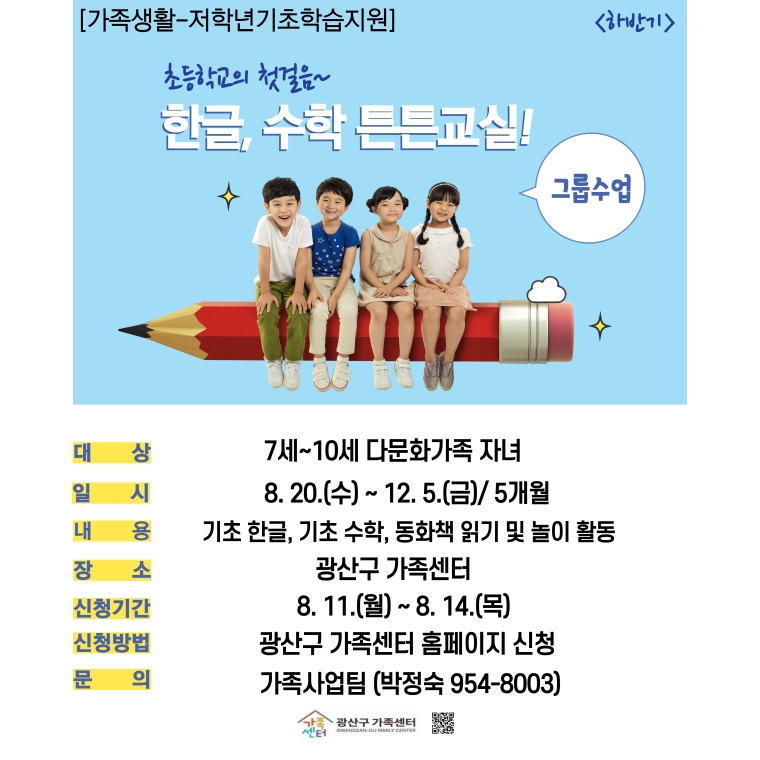 home 맘편한 내★일, 광주아이키움2.0 결혼·임신·출생 영유아 초·중·고 다양한 가족 일생활균형 커뮤니티 아동돌봄지원 소통방 나눔방 광주 아이키움 상담방 돌봄정보방 성폭력 피해 상담 및 사건지원 공지사항 우리동네 돌봄정보 기관별 공지사항 [광산구 가족센터]한글, 수학 튼튼교실! 등록일 : 2025-08-12 14:10 카테고리 : 카테고리 없음 작성자 : 운영자 조회수 : 75 [출처 : 광산구 가족센터] 목록