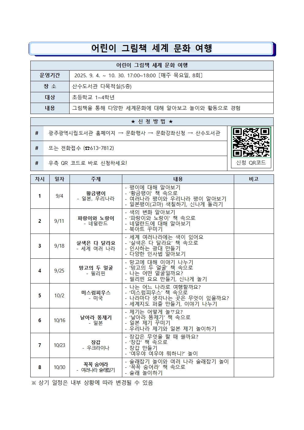 home 맘편한 내★일, 광주아이키움2.0 결혼·임신·출생 영유아 초·중·고 다양한 가족 일생활균형 커뮤니티 아동돌봄지원 소통방 나눔방 광주 아이키움 상담방 돌봄정보방 성폭력 피해 상담 및 사건지원 공지사항 우리동네 돌봄정보 기관별 공지사항 [산수도서관] 다문화서비스 지원 <어린이 그림책 세계 문화 여행> 등록일 : 2025-08-19 14:51 카테고리 : 카테고리 없음 작성자 : 운영자 조회수 : 68 [출처 : 산수도서관]2025년 산수도서관 다문화서비스 지원사업'어린이 그림책 세계 문화 여행' 참여자를 모집합니다.많은 관심과 참여 바랍니다. 목록
