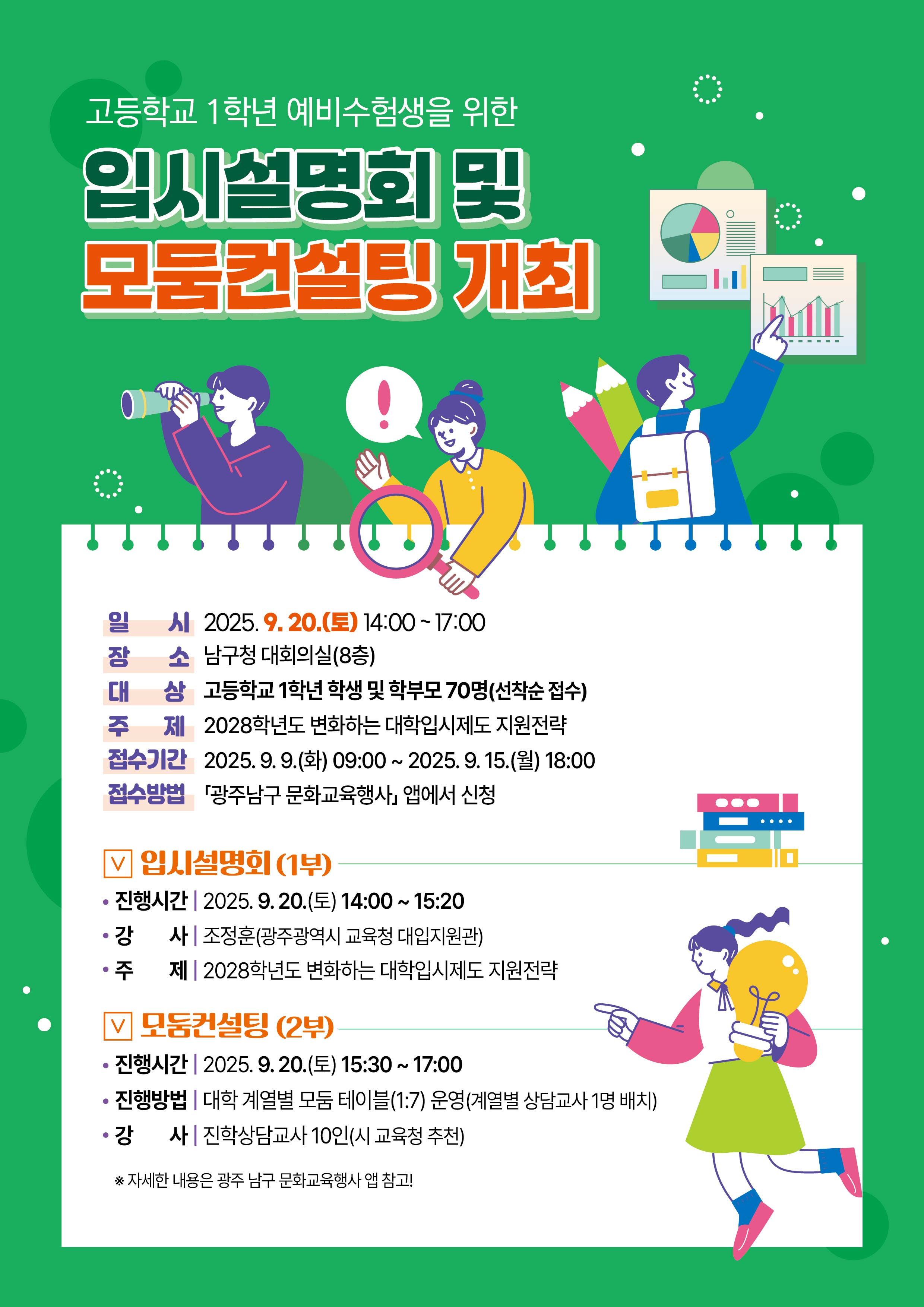 home 맘편한 내★일, 광주아이키움2.0 결혼·임신·출생 영유아 초·중·고 다양한 가족 일생활균형 커뮤니티 아동돌봄지원 소통방 나눔방 광주 아이키움 상담방 돌봄정보방 성폭력 피해 상담 및 사건지원 공지사항 우리동네 돌봄정보 기관별 공지사항 [남구청] 고1학년 예비수험생을 위한 입시설명회 등록일 : 2025-09-02 14:46 카테고리 : 카테고리 없음 작성자 : 운영자 조회수 : 71 [출처 : 광주광역시 남구청] 목록