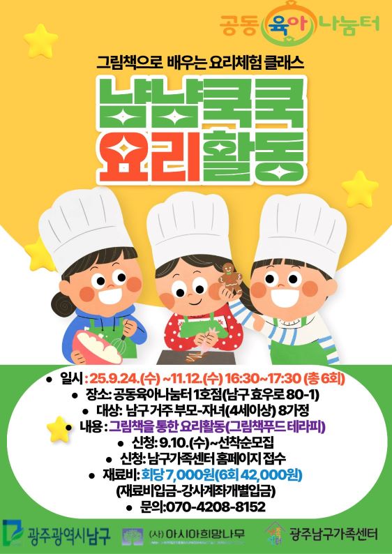 home 맘편한 내★일, 광주아이키움2.0 결혼·임신·출생 영유아 초·중·고 다양한 가족 일생활균형 커뮤니티 아동돌봄지원 소통방 나눔방 광주 아이키움 상담방 돌봄정보방 성폭력 피해 상담 및 사건지원 공지사항 우리동네 돌봄정보 기관별 공지사항 [광주광역시 남구가족센터] 냠냠쿡쿡 요리활동 등록일 : 2025-09-12 14:32 카테고리 : 카테고리 없음 작성자 : 운영자 조회수 : 77 [출처 : 광주광역시 남구가족센터] 목록