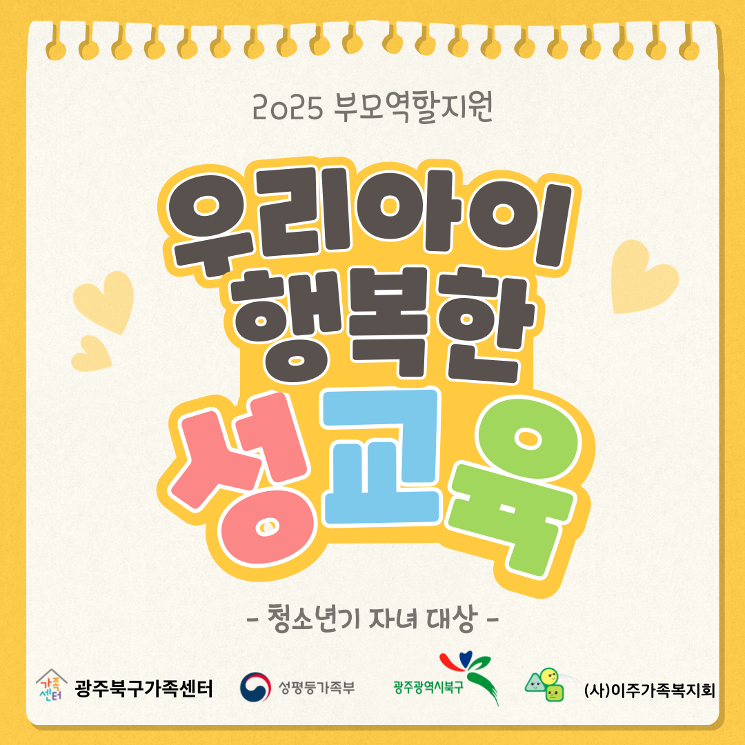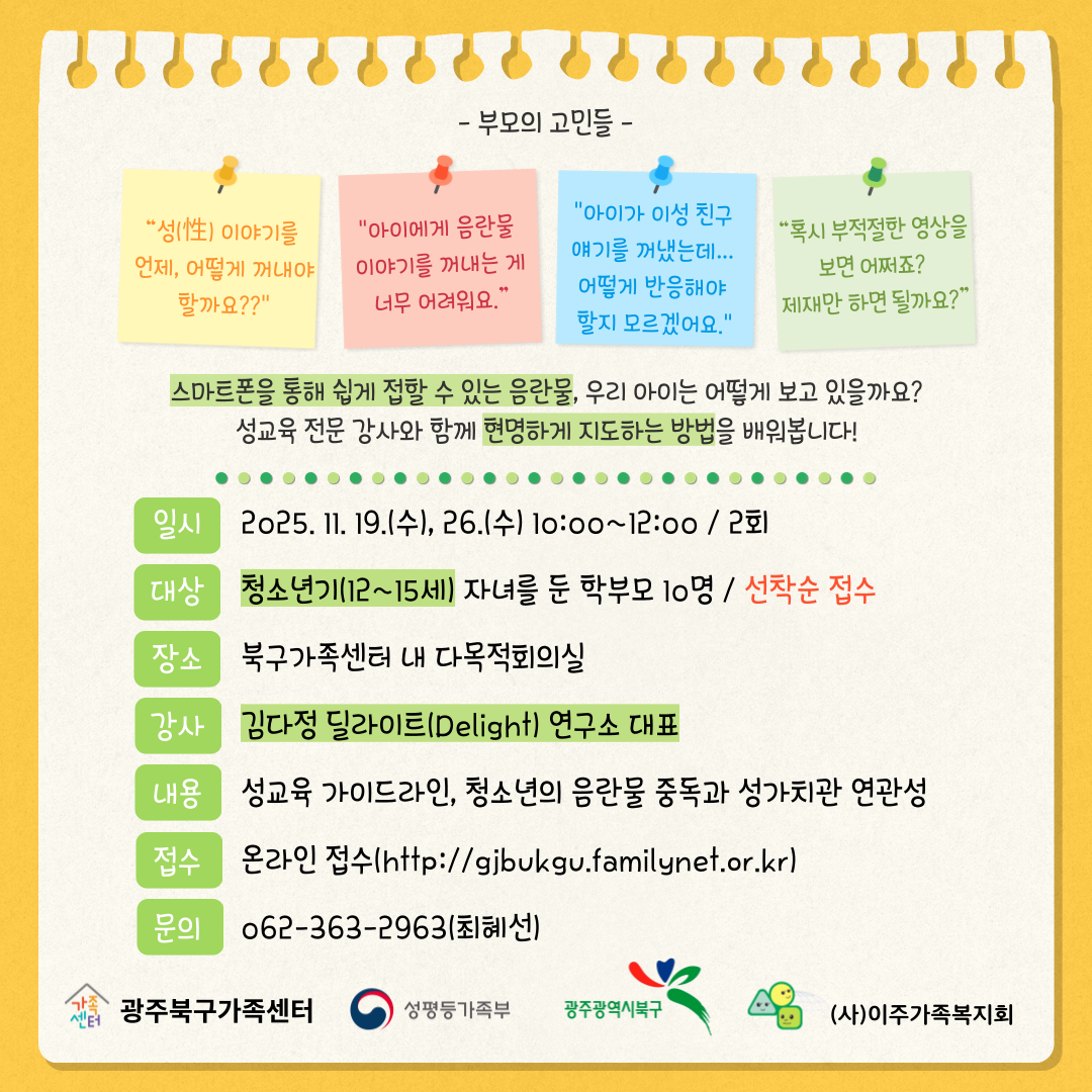 home 맘편한 내★일, 광주아이키움2.0 결혼·임신·출생 영유아 초·중·고 다양한 가족 일생활균형 커뮤니티 아동돌봄지원 소통방 나눔방 광주 아이키움 상담방 돌봄정보방 성폭력 피해 상담 및 사건지원 공지사항 우리동네 돌봄정보 기관별 공지사항 [북구가족센터]2025 부모역할지원 '우리아이 행복한 성교육' 등록일 : 2025-11-14 10:37 카테고리 : 카테고리 없음 작성자 : 운영자 조회수 : 67 행사기간2025-11-19 ~ 2025-11-26접수기간2025-11-12 12:00 ~ 2025-11-30 00:00참여대상청소년기(12~15세)자녀를 둔 학부모행사내용청소년기 자녀 대상 성교육회기정보총 2회차진행장소광주광역시 북구 하서로 195 (양산동) 광주북구가족센터출처:가족센터 목록