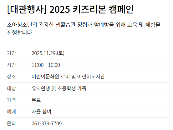 home 맘편한 내★일, 광주아이키움2.0 결혼·임신·출생 영유아 초·중·고 다양한 가족 일생활균형 커뮤니티 아동돌봄지원 소통방 나눔방 광주 아이키움 상담방 돌봄정보방 성폭력 피해 상담 및 사건지원 공지사항 우리동네 돌봄정보 기관별 공지사항 [ACC]소아청소년 암예방을 위한 2025 키즈리본 캠페인 등록일 : 2025-11-20 11:08 카테고리 : 카테고리 없음 작성자 : 운영자 조회수 : 73 목록