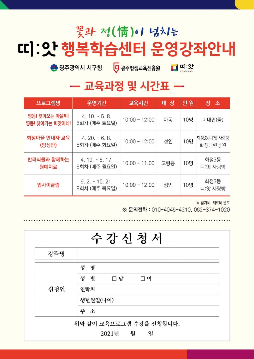 | 소개 : 꽃과 정이 넘치는 화정3동을 아우르고 지역주민의 정서함양과 전문적인 지식을 습득할 수 있는 배움의 터전이고 마을의 사랑방 및 쉼터로 아이들 돌봄, 청소년 쉼터, 학부모들의 모임터및 마을내 소통공간입니다 |