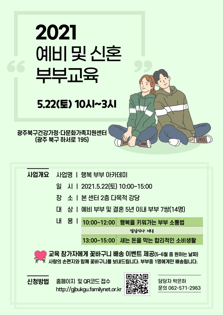 home 맘편한 내★일, 광주아이키움2.0 결혼·임신·출생 영유아 초·중·고 다양한 가족 일생활균형 커뮤니티 아동돌봄지원 소통방 나눔방 광주 아이키움 상담방 돌봄정보방 성폭력 피해 상담 및 사건지원 공지사항 우리동네 돌봄정보 기관별 공지사항 2021 예비 및 신혼부부 교육 ' 행복 부부 아카데미' 등록일 : 2021-05-06 15:07 작성자 : 북구건강가정다문화가족지원센터 조회수 : 511 [신청하기] ← 버튼을 눌러주세요 목록