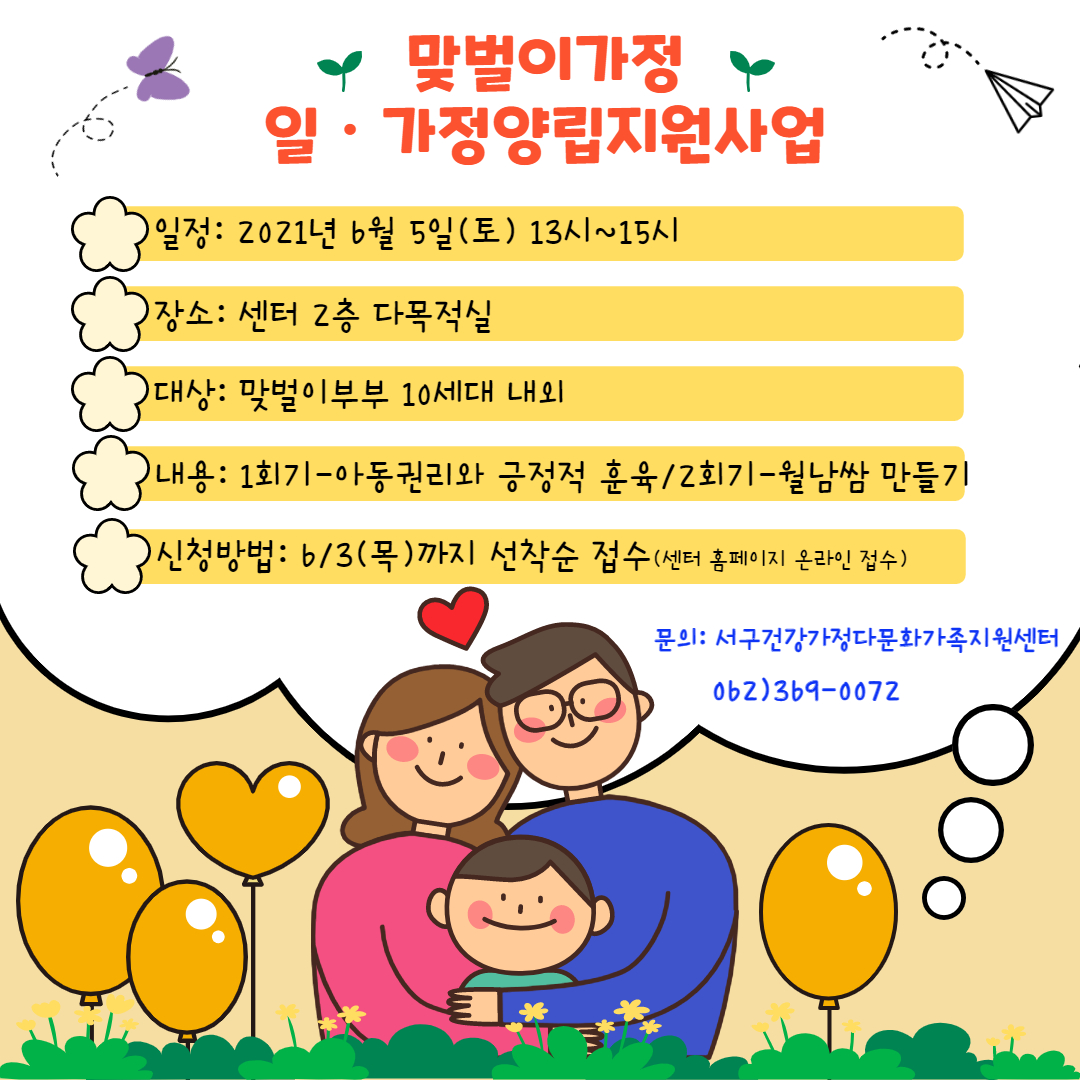 | 내용 | 서구건강가정다문화가족지원센터에서는 일과 가정의 균형있는 삶을 위해 일가정양립지원사업을 진행하고 있습니다. 맞벌이부부의 양육부담을 덜고 부모역량을 강화하기 위해 교육과 체험을 진행하오니 많은 참여 부탁드립니다^^ 문의사항은 센터 369-0072로 전화주세요~ ![]() |