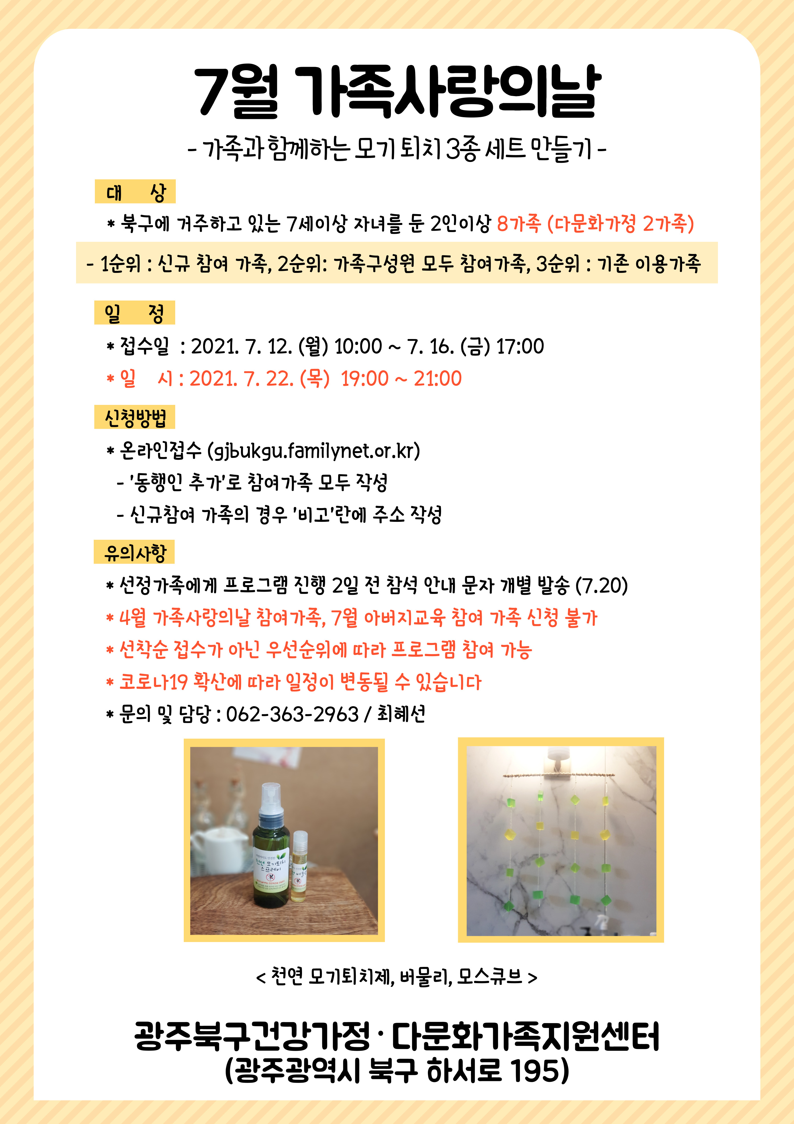 home 맘편한 내★일, 광주아이키움2.0 결혼·임신·출생 영유아 초·중·고 다양한 가족 일생활균형 커뮤니티 아동돌봄지원 소통방 나눔방 광주 아이키움 상담방 돌봄정보방 성폭력 피해 상담 및 사건지원 공지사항 우리동네 돌봄정보 기관별 공지사항 [광주북구건강가정·다문화가족지원센터] 7월 가족사랑의날_가족과 함께하는 모기퇴치 3종세트 만들기 등록일 : 2021-07-05 20:49 작성자 : 북구건강가정다문화가족지원센터 조회수 : 480 [홈페이지 접수] ← 버튼을 눌러주세요 목록