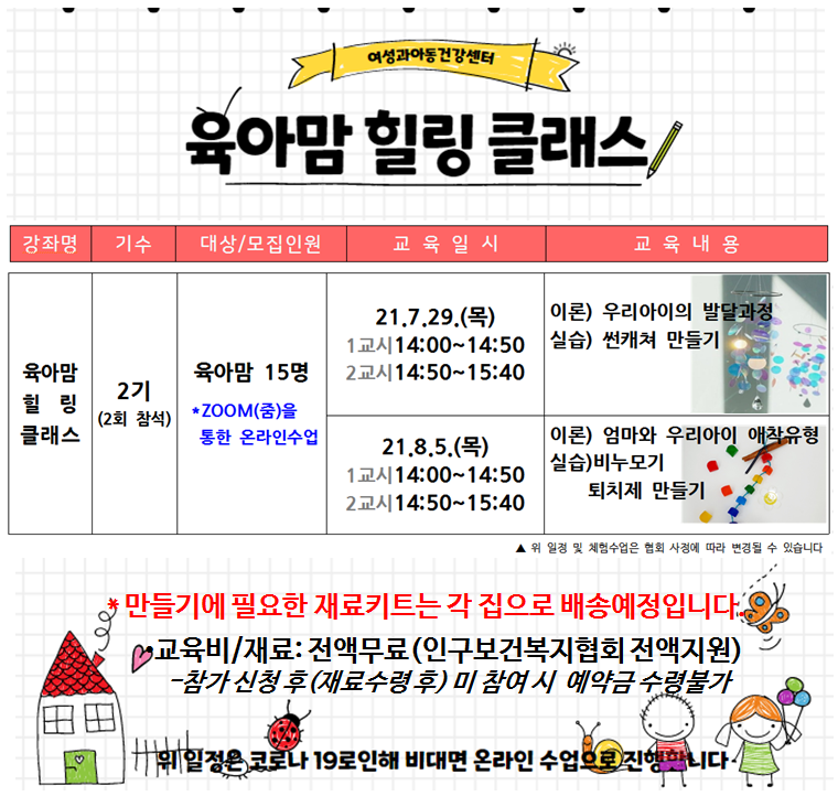 home 맘편한 내★일, 광주아이키움2.0 결혼·임신·출생 영유아 초·중·고 다양한 가족 일생활균형 커뮤니티 아동돌봄지원 소통방 나눔방 광주 아이키움 상담방 돌봄정보방 성폭력 피해 상담 및 사건지원 공지사항 우리동네 돌봄정보 기관별 공지사항 [인구보건복지협회] 육아맘 힐링클래스 참여자 모집안내 등록일 : 2021-07-20 09:44 작성자 : 인구보건협회 조회수 : 488 인구보건복지협회 광주전남지회 네이버 카페 '맘맘맘 광주전남' 를 통해 신청 접수 가능합니다.https://cafe.naver.com/mammammamgwangju/312343맘맘맘 클래스 신청http://naver.me/GqBIdCKV 목록