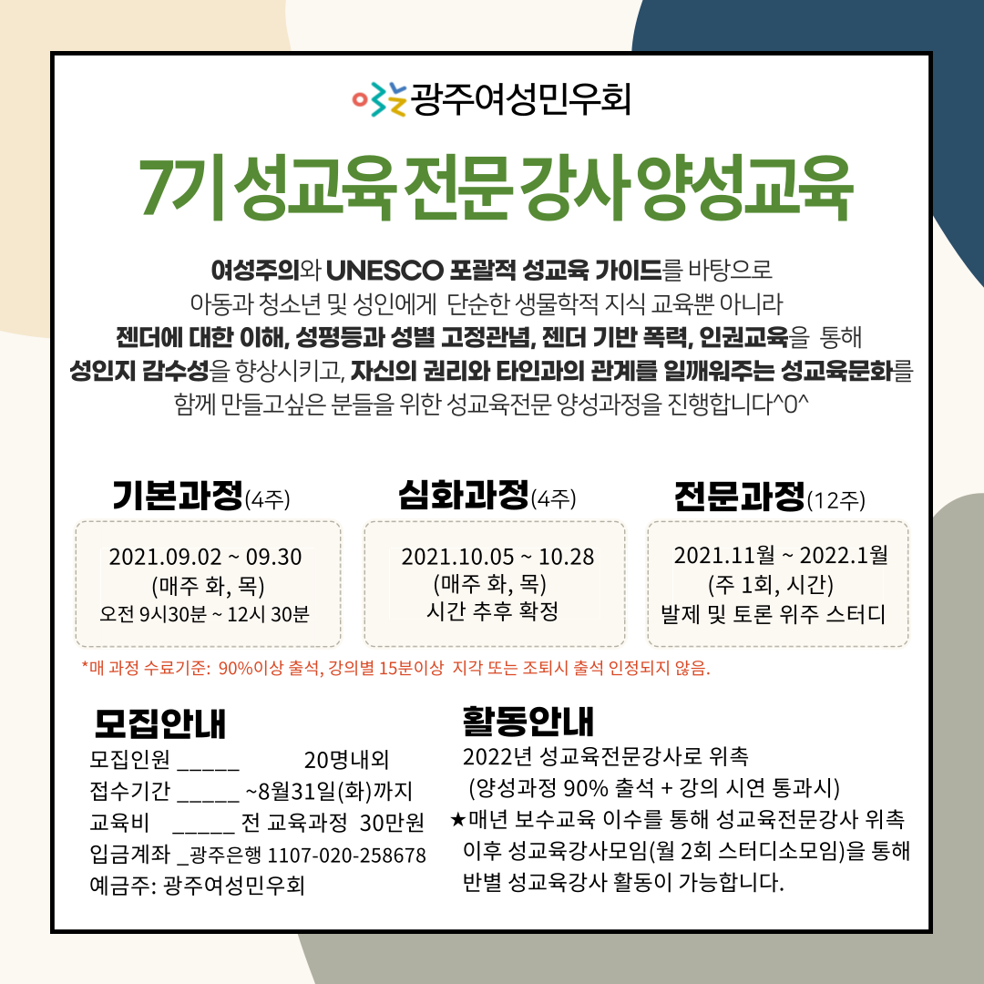 | 내용 | 7기 성교육 전문 강사 양성교육 여성주의와 UNESCO 포괄적 성교육 가이드를 바탕으로 아동과 청소년 및 성인에게 단순한 생물학적 지식 교육뿐 아니라 젠더에 대한 이해, 성평등과 성별 고정관념, 젠더 기반 폭력, 인권교육을 통해 성인지 감수성을 향상시키고, 자신의 권리와 타인과의 관계를 일깨워주는 성교육문화를 함께 만들고 싶은 분들을 위한 성교육전문 양성과정을 진행합니다^0^ 모집안내 ○ 모집인원 : 20명 내외 ○ 접수기간 : ~ 2021. 8. 31.(화)까지. 구글 신청서 접수 https://forms.gle/VK7Phe9Z7onFBzL97 ○ 교 육 비 : 30만원 ○ 입금계좌 : 광주은행 1107-020-258678 (예금주:광주여성민우회) 2. 주요일정 ○ 기본과정(4주) : 2021.09.02. ~ 09.30 (매주 화, 목) , 오전 9시30분 ~ 12시 30분 ○ 심화과정(4주) : 2021.10.05 ~ 10.28 (매주 화, 목) , 오전 9시30분 ~ 12시 30분 ○ 전문과정(12주) : 2021.11월 ~ 2022.1월 (주 1회, 2시간) 토론 스터디 및 강의 시연 ※ 각 과정 수료기준 : 90%이상 출석, 15분 이상 지각 또는 조퇴시 출석 인정 안됨 심화, 전문과정은 이전 과정을 수료하신 분만 신청하실 수 있습니다 전문과정 강의시연을 통과하신 분에 한해 2022년 성교육전문강사 위촉장이 발급됩니다. 3. 활동혜택 ○ 2022년 성교육전문강사로 위촉 (양성과정 90% 출석, 강의 시연 통과 시) ○ 과정 이후 성교육전문강사모임(월 2회 스터디 소모임)을 통해 광주여성민우회 교육센터의 반별 성교육강사 활동이 가능합니다. ※ 매년 성교육전문강사 위촉 (보수교육 이수 조건) 4. 문의사항 광주여성민우회 교육센터 062-521-1360 . 기본/ 전문과정 커리큘럼