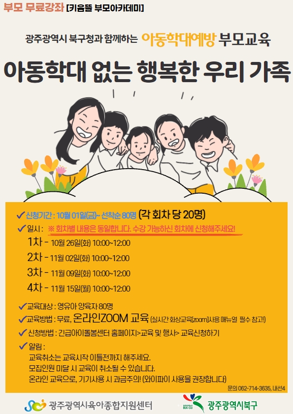 home 맘편한 내★일, 광주아이키움2.0 결혼·임신·출생 영유아 초·중·고 다양한 가족 일생활균형 커뮤니티 아동돌봄지원 소통방 나눔방 광주 아이키움 상담방 돌봄정보방 성폭력 피해 상담 및 사건지원 공지사항 우리동네 돌봄정보 기관별 공지사항 [광주육아종합지원센터] 무료강좌- 키움뜰 부모아카데미 [아동학대예방 부모교육] 온라인zoom교육 등록일 : 2021-10-18 10:26 작성자 : 광주육아종합지원센터 조회수 : 380 첨부파일 제목을 입력하세요 - 2021-10-06T160843.739.jpg 다운로드 https://www.gjicare.or.kr/ 신청하는곳<< 목록