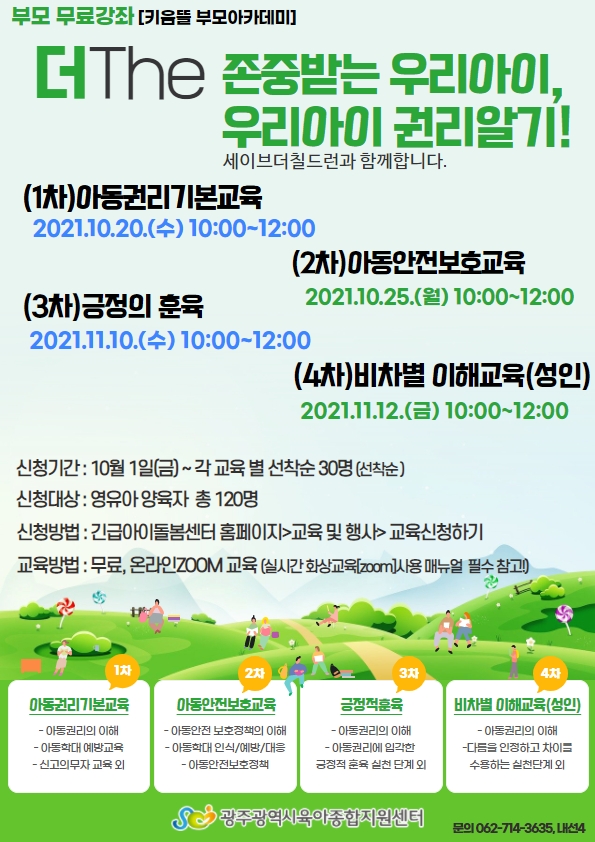 home 맘편한 내★일, 광주아이키움2.0 결혼·임신·출생 영유아 초·중·고 다양한 가족 일생활균형 커뮤니티 아동돌봄지원 소통방 나눔방 광주 아이키움 상담방 돌봄정보방 성폭력 피해 상담 및 사건지원 공지사항 우리동네 돌봄정보 기관별 공지사항 [광주육아종합지원센터] 무료강좌- 키움뜰 부모아카데미 [자녀권리존중 부모교육] 온라인zoom교육 등록일 : 2021-10-18 10:28 작성자 : 광주육아종합지원센터 조회수 : 361 원하시는 회차의 교육을 신청해주세요^^https://www.gjicare.or.kr/ 목록