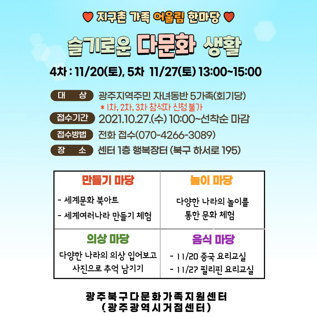 home 맘편한 내★일, 광주아이키움2.0 결혼·임신·출생 영유아 초·중·고 다양한 가족 일생활균형 커뮤니티 아동돌봄지원 소통방 나눔방 광주 아이키움 상담방 돌봄정보방 성폭력 피해 상담 및 사건지원 공지사항 우리동네 돌봄정보 기관별 공지사항 [광주북구건강가정·다문화가족지원센터] 슬기로운 다문화생활 등록일 : 2021-10-28 10:05 작성자 : 북구건강가정다문화가족지원센터 조회수 : 319 목록