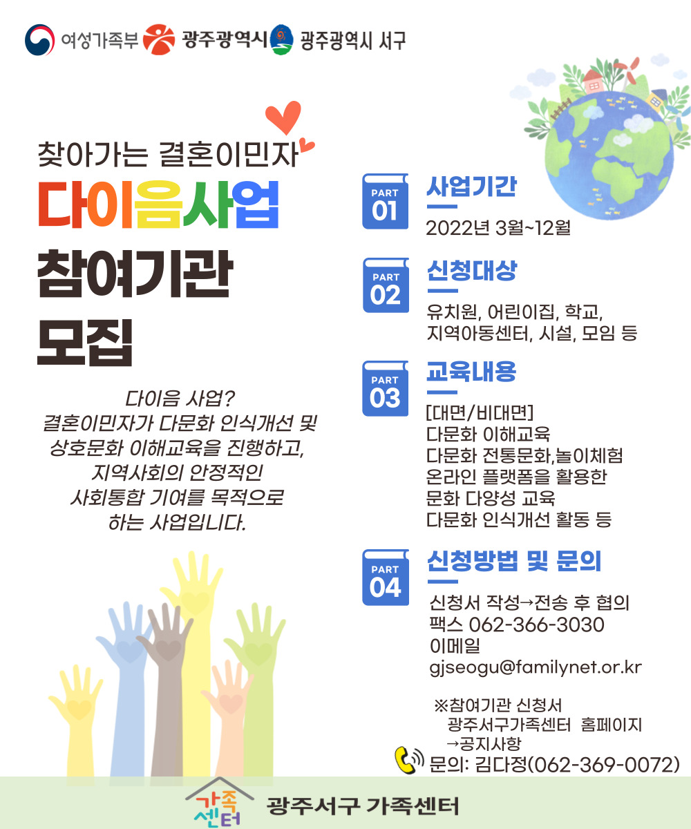 home 맘편한 내★일, 광주아이키움2.0 결혼·임신·출생 영유아 초·중·고 다양한 가족 일생활균형 커뮤니티 아동돌봄지원 소통방 나눔방 광주 아이키움 상담방 돌봄정보방 성폭력 피해 상담 및 사건지원 공지사항 우리동네 돌봄정보 기관별 공지사항 [광주서구가족센터] 찾아가는 결혼이민자 다이음 사업(다문화이해교육) 참여기관 모집 등록일 : 2022-02-16 15:46 작성자 : 서구건강가정다문화가족지원센터 조회수 : 235 첨부파일 2022 다이음 사업 기관 신청서.hwp 다운로드 첨부파일 찾아가는 결혼이민자 다이음 사업 참여기관 모집 안내.hwp 다운로드 목록