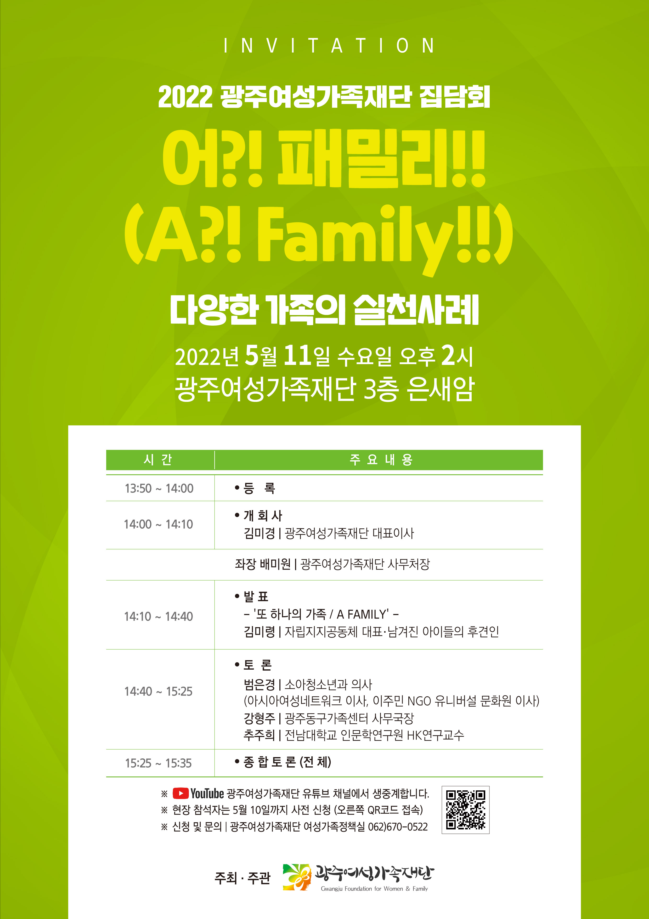 home 맘편한 내★일, 광주아이키움2.0 결혼·임신·출생 영유아 초·중·고 다양한 가족 일생활균형 커뮤니티 아동돌봄지원 소통방 나눔방 광주 아이키움 상담방 돌봄정보방 성폭력 피해 상담 및 사건지원 공지사항 우리동네 돌봄정보 기관별 공지사항 2022년 광주여성가족재단 집담회 개최 안내 등록일 : 2022-05-09 14:50 작성자 : 서구가족센터 조회수 : 218 ▶ 행사명: 2022년 광주여성가족재단 집담회 개최 "어?! 패밀리 (A?! Family!!) - 다양한 가족의 실천사례 -▶ 개최일정: 2022. 5. 11.(수) 오후 14시 ~▶ 장소: 광주여성가족재단 3층 은새암▶ 문의사항: 여성가족정책실 오현경 (062-670-0522)* 자세한 사항은 첨부된 웹홍보물 또는 재단 홈페이지(https://www.gjwf.or.kr/) 참고 바랍니다. 목록