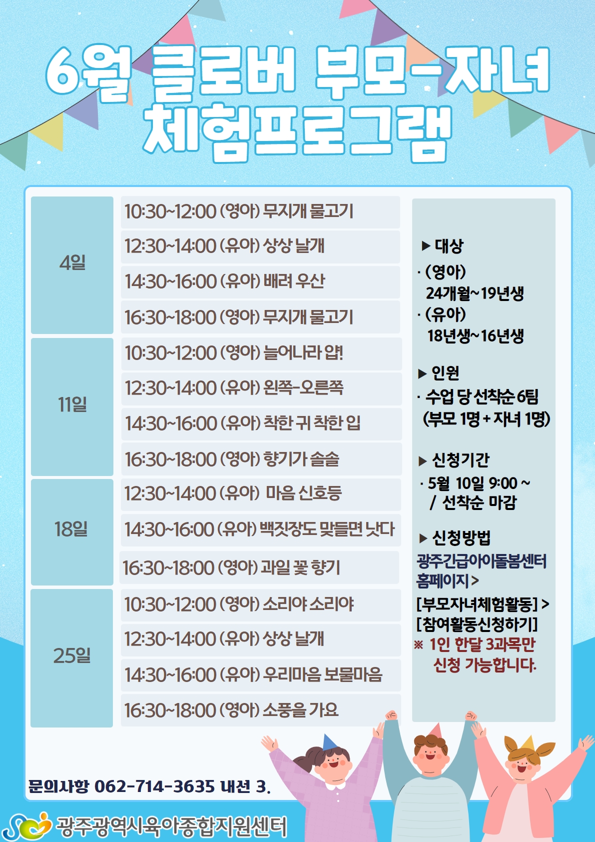 home 맘편한 내★일, 광주아이키움2.0 결혼·임신·출생 영유아 초·중·고 다양한 가족 일생활균형 커뮤니티 아동돌봄지원 소통방 나눔방 광주 아이키움 상담방 돌봄정보방 성폭력 피해 상담 및 사건지원 공지사항 우리동네 돌봄정보 기관별 공지사항 [광주육아종합지원센터] 6월 부모-자녀체험프로그램 등록일 : 2022-05-10 11:12 작성자 : 광주육아종합지원센터 조회수 : 249 [광주긴급아이돌봄센터 홈페이지] - [교육및행사]에서 신청가능합니다!많은 관심과 신청 바랍니다 목록