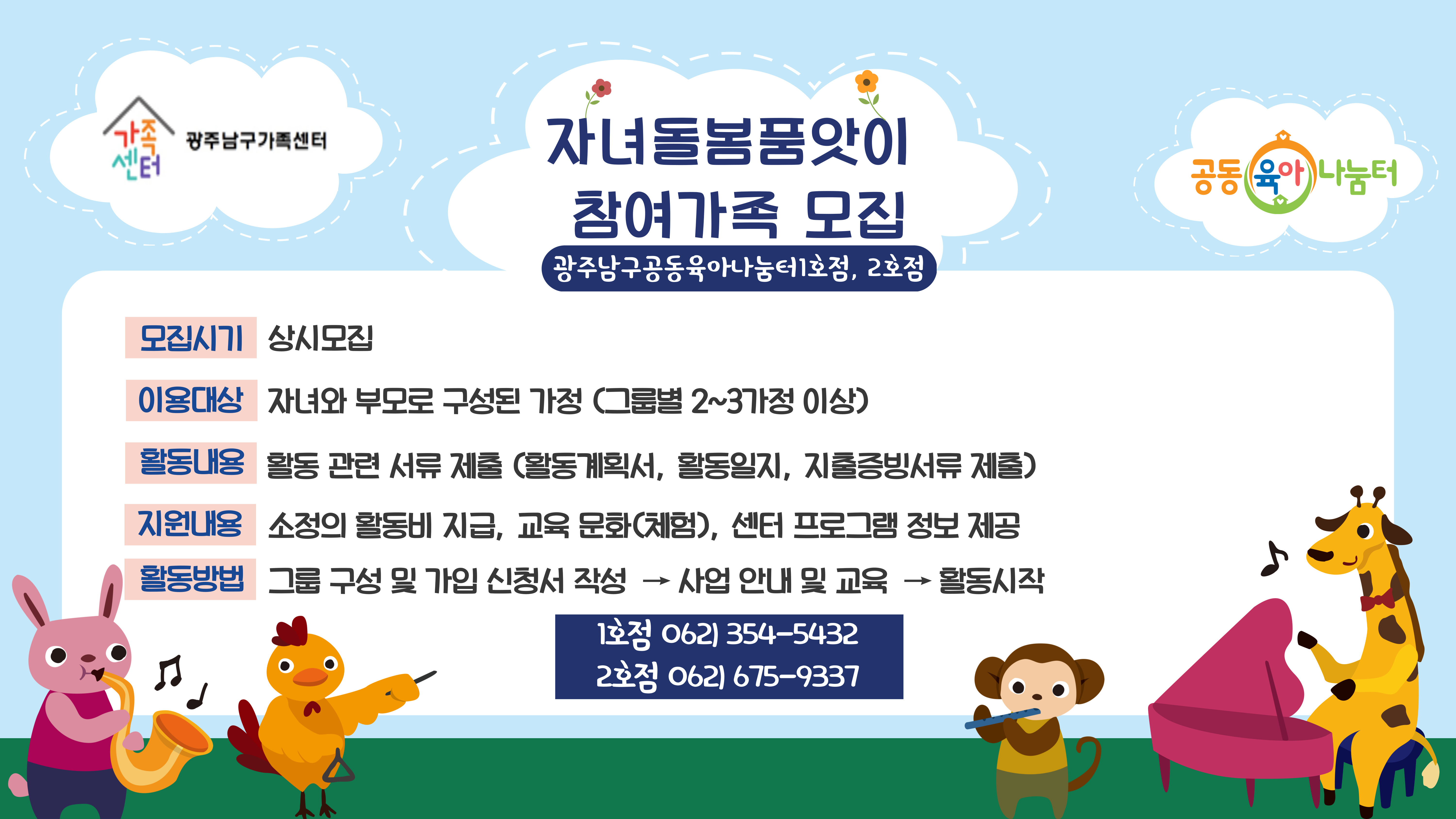 home 맘편한 내★일, 광주아이키움2.0 결혼·임신·출생 영유아 초·중·고 다양한 가족 일생활균형 커뮤니티 아동돌봄지원 소통방 나눔방 광주 아이키움 상담방 돌봄정보방 성폭력 피해 상담 및 사건지원 공지사항 우리동네 돌봄정보 기관별 공지사항 광주남구공동육아나눔터 <자녀돌봄품앗이 모집안내> 등록일 : 2022-05-17 11:18 작성자 : 남구가족센터 조회수 : 248 안녕하세요~~남구공동육아나눔터입니다.저희 남구공동육아나눔터 1~ 2호점에서 자녀돌봄품앗이를 모집하고 있습니다.자세한 내용은 알림방을 참고 바랍니다. 목록