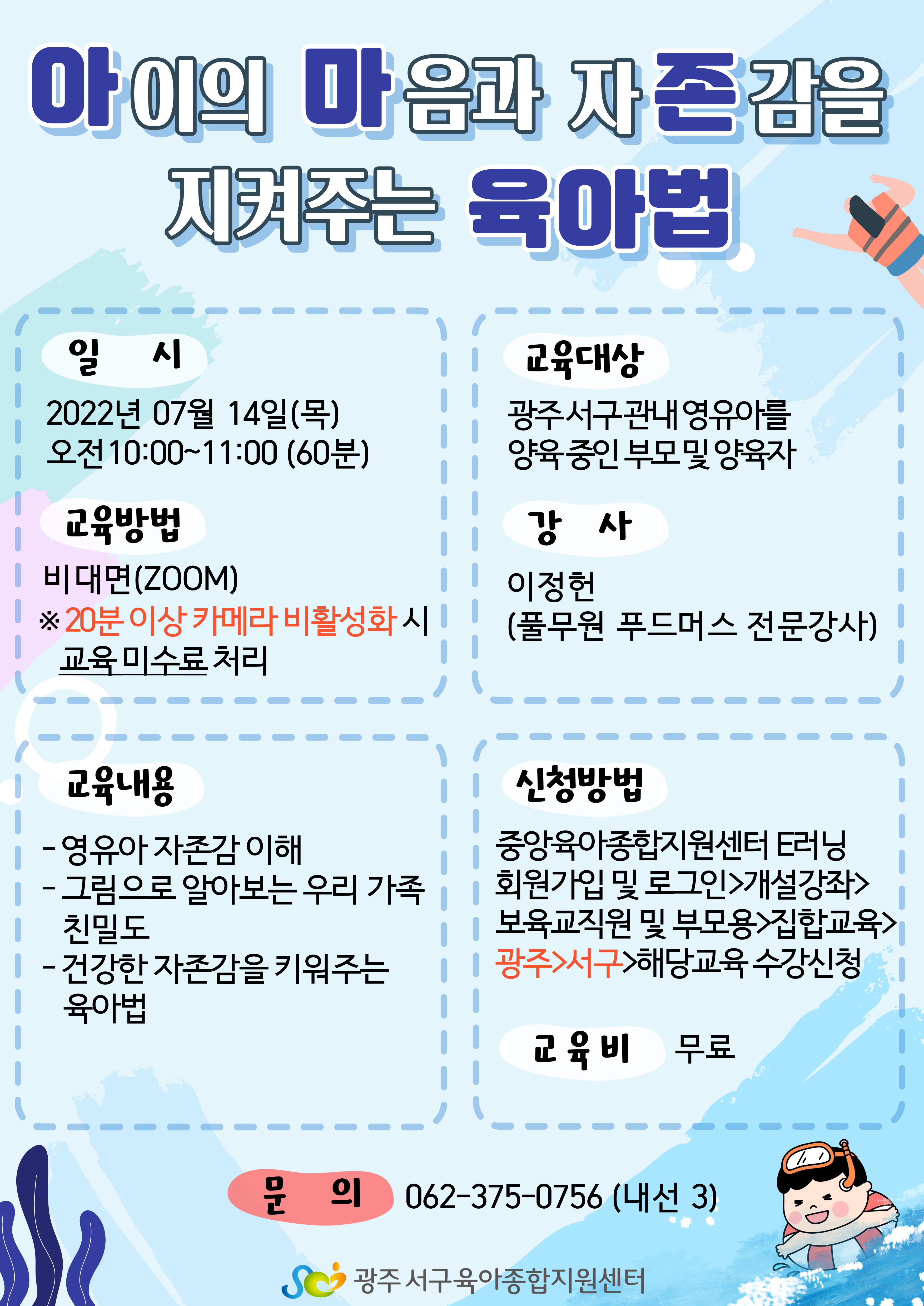 home 맘편한 내★일, 광주아이키움2.0 결혼·임신·출생 영유아 초·중·고 다양한 가족 일생활균형 커뮤니티 아동돌봄지원 소통방 나눔방 광주 아이키움 상담방 돌봄정보방 성폭력 피해 상담 및 사건지원 공지사항 우리동네 돌봄정보 기관별 공지사항 [광주서구육아종합지원센터] 아이의 마음과 자존감을 지켜주는 육아법 등록일 : 2022-06-13 20:44 작성자 : 서구육아종합지원센터 조회수 : 201 목록
