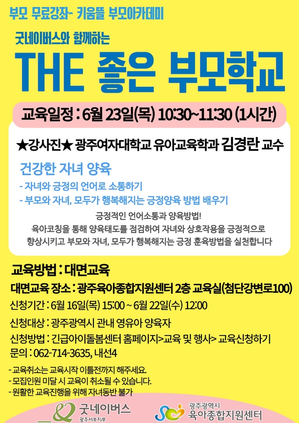 home 맘편한 내★일, 광주아이키움2.0 결혼·임신·출생 영유아 초·중·고 다양한 가족 일생활균형 커뮤니티 아동돌봄지원 소통방 나눔방 광주 아이키움 상담방 돌봄정보방 성폭력 피해 상담 및 사건지원 공지사항 우리동네 돌봄정보 기관별 공지사항 [키움뜰 부모아카데미/ 대면교육] the 좋은 부모교실 2차- 건강한 자녀양육(긍정의 언어로 소통하기) 등록일 : 2022-06-16 15:30 작성자 : 광주육아종합지원센터 조회수 : 266 첨부파일 더 좋은 부모학교 (6).jpg 다운로드 첨부파일 제목을 입력하세요 - 2022-06-16T152228.105.jpg 다운로드 첨부파일 더 좋은 부모학교 (2).jpg 다운로드 긴급아이돌봄센터 홈페이지>>https://www.gjicare.or.kr/신청하기 카테고리>>https://www.gjicare.or.kr/page/edu/edu_list 목록