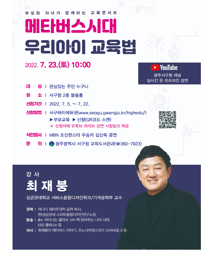 home 맘편한 내★일, 광주아이키움2.0 결혼·임신·출생 영유아 초·중·고 다양한 가족 일생활균형 커뮤니티 아동돌봄지원 소통방 나눔방 광주 아이키움 상담방 돌봄정보방 성폭력 피해 상담 및 사건지원 공지사항 우리동네 돌봄정보 기관별 공지사항 부모와 자녀가 함께하는 교육콘서트 <메타버스시대 우리아이 교육법> 등록일 : 2022-07-15 10:08 작성자 : 운영자 조회수 : 236 첨부파일 메타버스.png 다운로드 부모와 자녀가 함께 하는 교육 콘서트 < 메타버스시대 우리아이 교육법>2022. 7.23. (토) 10:00대 상 : 관심있는 주민 누구나장 소 : 서구청 2층 들불홀신청기간 : 서구하이에듀넷 - 부모교육 - 신청 (QR코드 스캔)문 의 : 광주광역시 서구청 교육도서관과 (360-7923) 목록