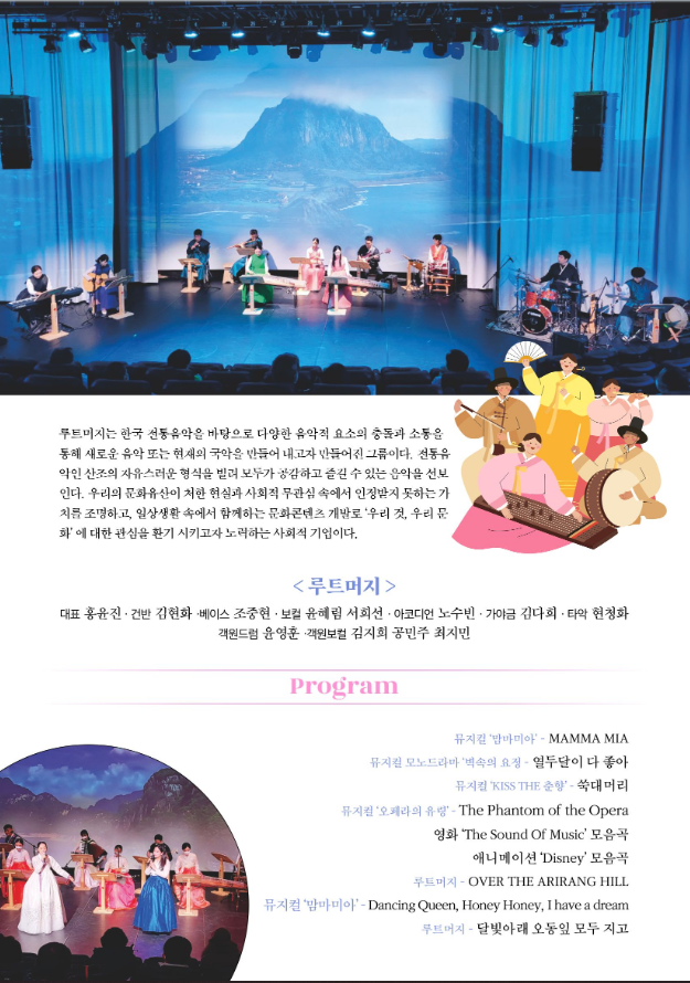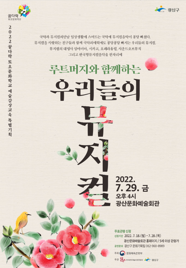 home 맘편한 내★일, 광주아이키움2.0 결혼·임신·출생 영유아 초·중·고 다양한 가족 일생활균형 커뮤니티 아동돌봄지원 소통방 나눔방 광주 아이키움 상담방 돌봄정보방 성폭력 피해 상담 및 사건지원 공지사항 우리동네 돌봄정보 기관별 공지사항 <루트머지와 함께하는 우리들의 뮤지컬> 한국형 국악뮤지컬에 여러분을 초대합니다. 등록일 : 2022-07-21 10:05 작성자 : 운영자 조회수 : 167 예매는 광산 문화예술회관 홈페이지에서 가능합니다. https://www.culture.go.kr/oneeye/oneEyeView.do?uci=G7061658265553025 목록