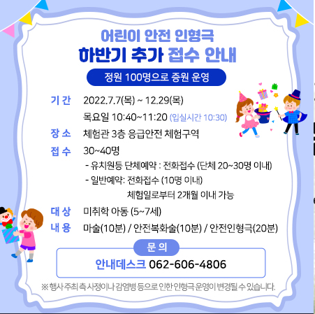 home 맘편한 내★일, 광주아이키움2.0 결혼·임신·출생 영유아 초·중·고 다양한 가족 일생활균형 커뮤니티 아동돌봄지원 소통방 나눔방 광주 아이키움 상담방 돌봄정보방 성폭력 피해 상담 및 사건지원 공지사항 우리동네 돌봄정보 기관별 공지사항 빛고을 국민안전체험관 < 어린이 안전 인형극> 하반기 추가 접수 등록일 : 2022-07-26 16:37 작성자 : 운영자 조회수 : 177 <어린이 안전 인형극> 하반기 추가 접수 안내 - 정원 100명으로 증원 운영합니다. 기간 : 2022. 7.7(목) ~ 12. 29(목) / 목요일 10:40~11:20 (입실시간 10:30)장소 : 체험관 3층 응급안전 체험구역접수 : 30~40명대상 : 미취학 아동 (5~7세)내용 : 마술, 안전복화술, 안전인형극 목록