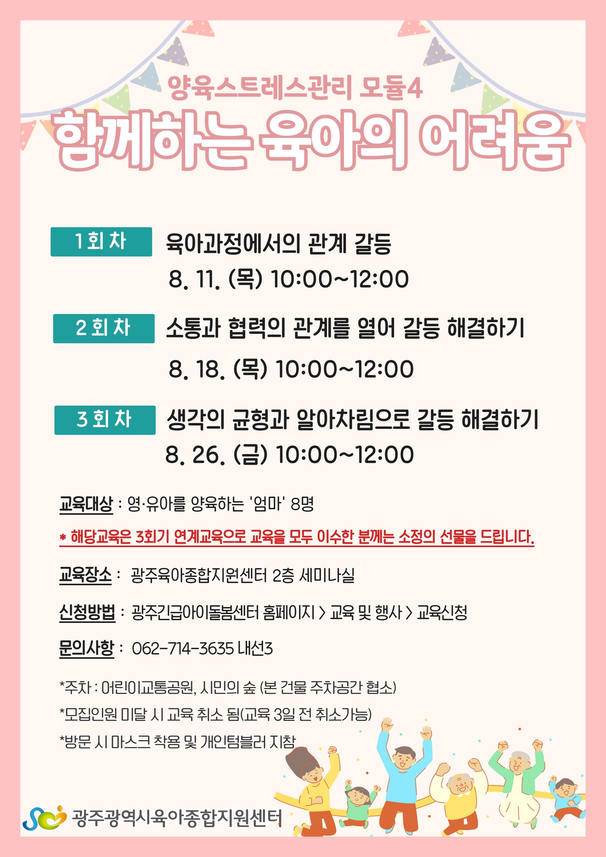 home 맘편한 내★일, 광주아이키움2.0 결혼·임신·출생 영유아 초·중·고 다양한 가족 일생활균형 커뮤니티 아동돌봄지원 소통방 나눔방 광주 아이키움 상담방 돌봄정보방 성폭력 피해 상담 및 사건지원 공지사항 우리동네 돌봄정보 기관별 공지사항 [광주육아종합지원센터](공통부모교육_무료강좌)함께하는 육아의 어려움 등록일 : 2022-08-01 09:20 작성자 : 광주육아종합지원센터 조회수 : 212 (신청 바로가기) 교육 및 행사 | 광주육아지원 통합 플렛폼 긴급아이돌봄센터 (gjicare.or.kr) 목록