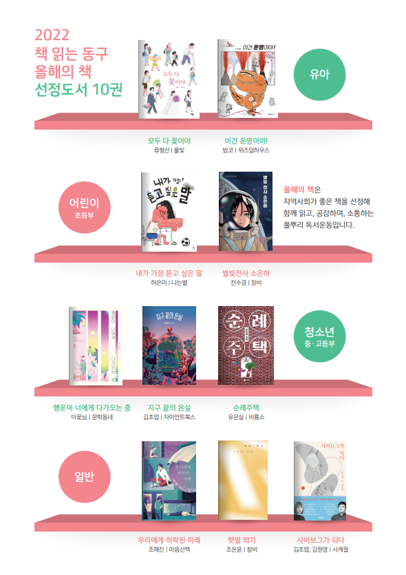 - 올해의 책은 구민이 선정한 책을 함께 읽고, 소통하며 삶의 지혜를 찾아가는 인문도시 동구의 독서문화 운동입니다. 지역 독서활성화를 위한 구민도서지원, 작가강연,