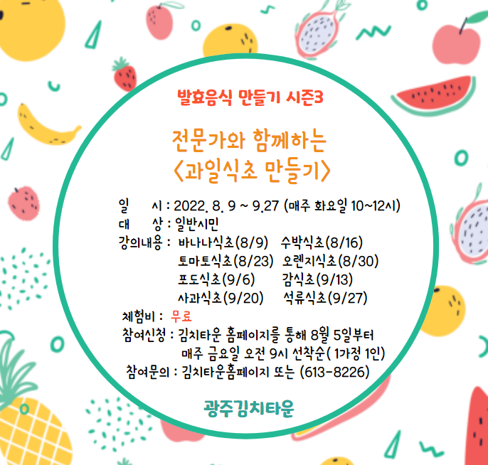 강의는 바나나식초(8월9일) 수박식초(8월16일) 토마토식초(8월 23일) 오렌지식초(8월 30일) 포도식초(9월6일) 감식초(9월13일)