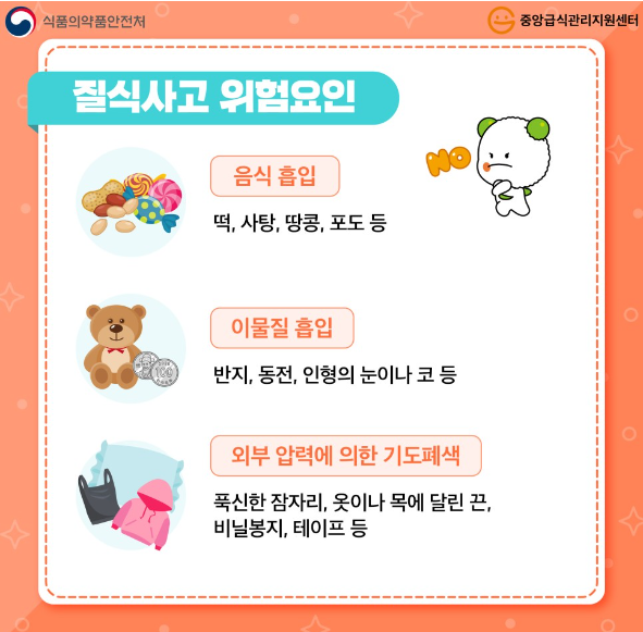 질식사고 위험요인으로는 떡 사탕, 땅콩, 포도 등의 음식 흡입과 반지 동전,인형의 눈이나 코 등의 이물질 흡입, 푹신한 잠자리, 옷이나 목에 달린 끈, 비닐봉지, 테이프 등 외부 압력에 의한