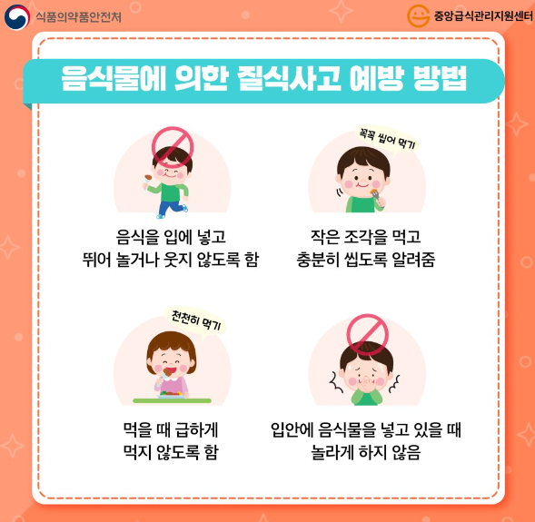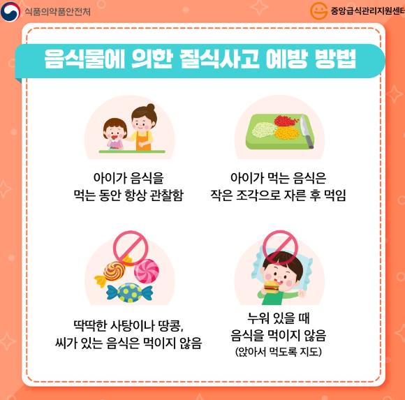 음식물에 의한 질식사고 예방을 위해 아이가 음식을 먹는 동안 항상 관찰하고, 음식은 작은 조각으로 잘라서 먹이며, 딱딱한 사탕이나 땅콩, 씨가 있는 음식은 먹이지 않고, 누워있을 때 먹지