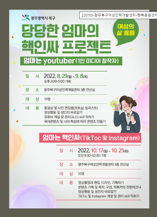 1. 취업역량을 키우는 ITQ자격증 과정 2. 엄마는 youtuber (유투브 동영상 및 사진 편집법, 유투브 개설 관리 스킬 익히기)