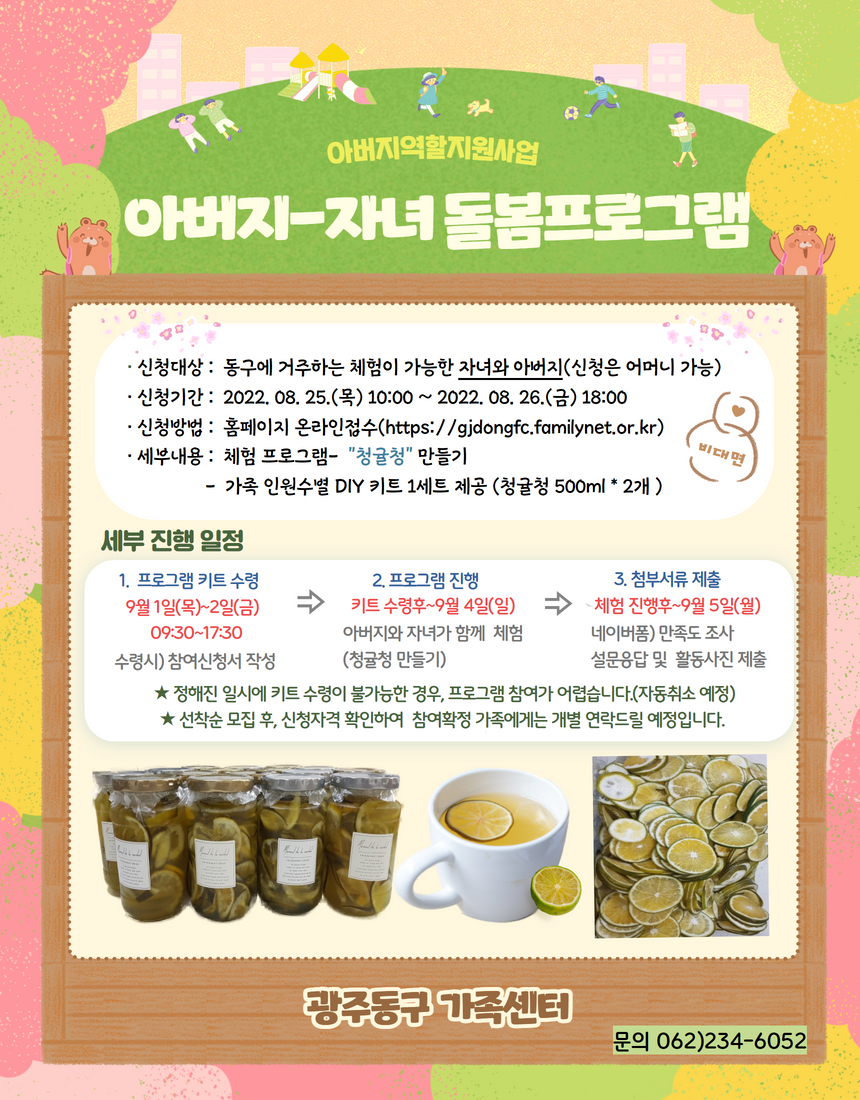 home 맘편한 내★일, 광주아이키움2.0 결혼·임신·출생 영유아 초·중·고 다양한 가족 일생활균형 커뮤니티 아동돌봄지원 소통방 나눔방 광주 아이키움 상담방 돌봄정보방 성폭력 피해 상담 및 사건지원 공지사항 우리동네 돌봄정보 기관별 공지사항 [광주동구 가족센터] 아버지-자녀 돌봄프로그램 "청귤청 만들기" 참여자 모집 등록일 : 2022-08-23 14:09 작성자 : 동구가족센터 조회수 : 228 목록