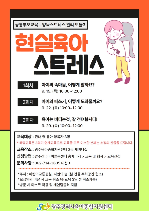 home 맘편한 내★일, 광주아이키움2.0 결혼·임신·출생 영유아 초·중·고 다양한 가족 일생활균형 커뮤니티 아동돌봄지원 소통방 나눔방 광주 아이키움 상담방 돌봄정보방 성폭력 피해 상담 및 사건지원 공지사항 우리동네 돌봄정보 기관별 공지사항 [광주육아종합지원센터]양육스트레스 관리 부모교육 : 현실 육아 스트레스 등록일 : 2022-08-24 15:53 작성자 : 광주육아종합지원센터 조회수 : 204 목록