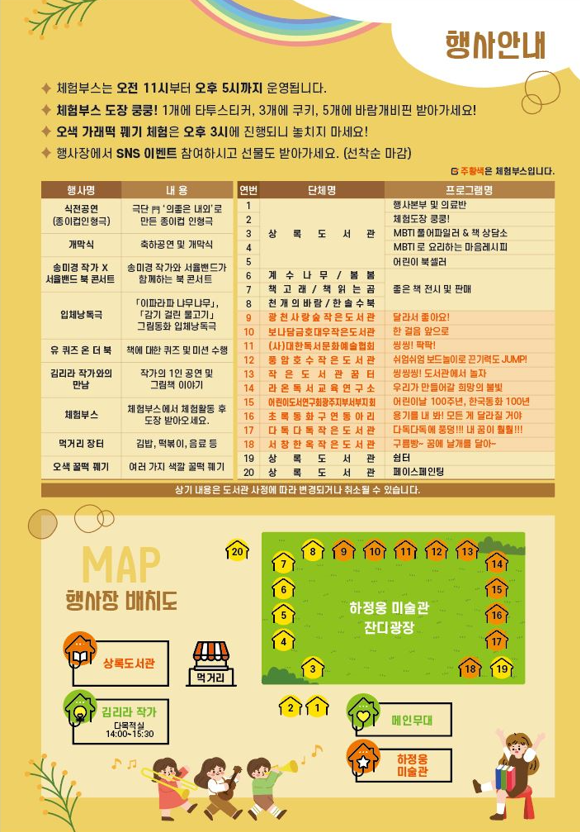 주요내용 : 개막식, 북콘서트, 입체낭독극, 체험부스 운영 등