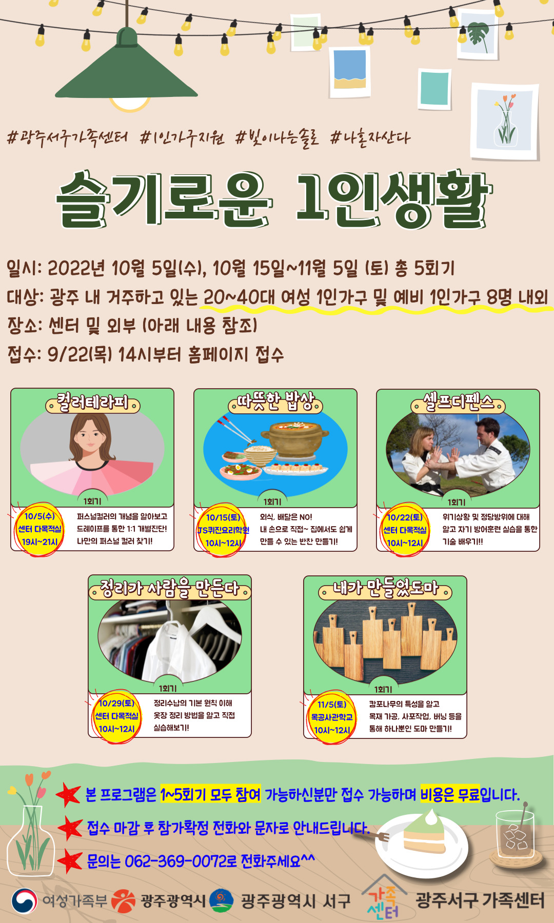 서구가족센터에서는 광주 내 20~40대 여성 1인가구 및 예비 1인가구를 대상으로 프로그램을 진행하고자 합니다.