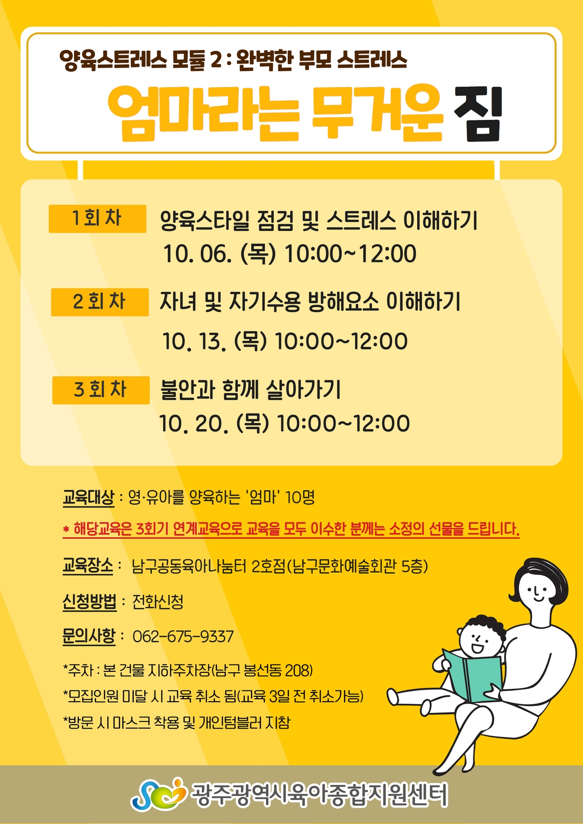 home 맘편한 내★일, 광주아이키움2.0 결혼·임신·출생 영유아 초·중·고 다양한 가족 일생활균형 커뮤니티 아동돌봄지원 소통방 나눔방 광주 아이키움 상담방 돌봄정보방 성폭력 피해 상담 및 사건지원 공지사항 우리동네 돌봄정보 기관별 공지사항 [광주육아종합지원센터] 10월 양육스트레스관리 : 엄마라는 무거운 짐 등록일 : 2022-09-22 17:11 작성자 : 광주육아종합지원센터 조회수 : 187 목록