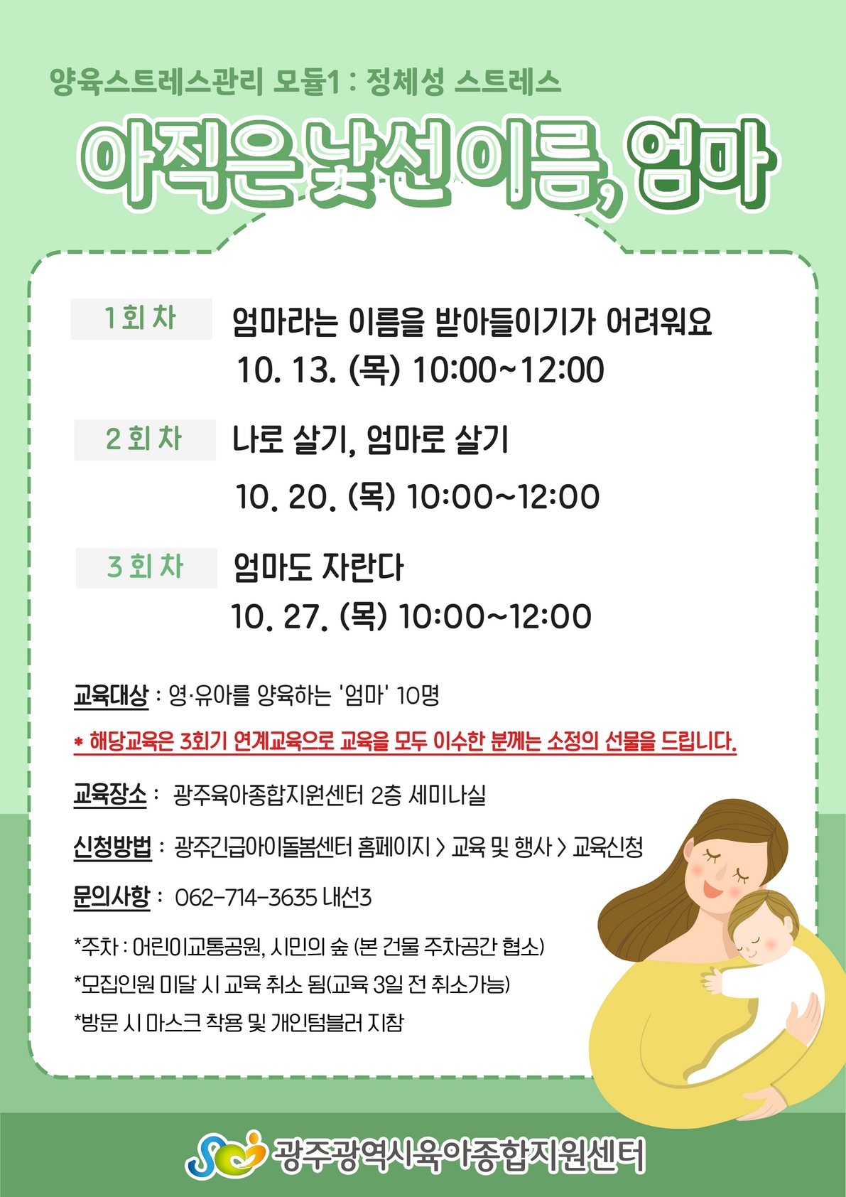 home 맘편한 내★일, 광주아이키움2.0 결혼·임신·출생 영유아 초·중·고 다양한 가족 일생활균형 커뮤니티 아동돌봄지원 소통방 나눔방 광주 아이키움 상담방 돌봄정보방 성폭력 피해 상담 및 사건지원 공지사항 우리동네 돌봄정보 기관별 공지사항 [광주육아종합지원센터] 10월 양육스트레스관리 : 아직은 낯선이름 엄마 등록일 : 2022-09-22 17:13 작성자 : 광주육아종합지원센터 조회수 : 185 목록