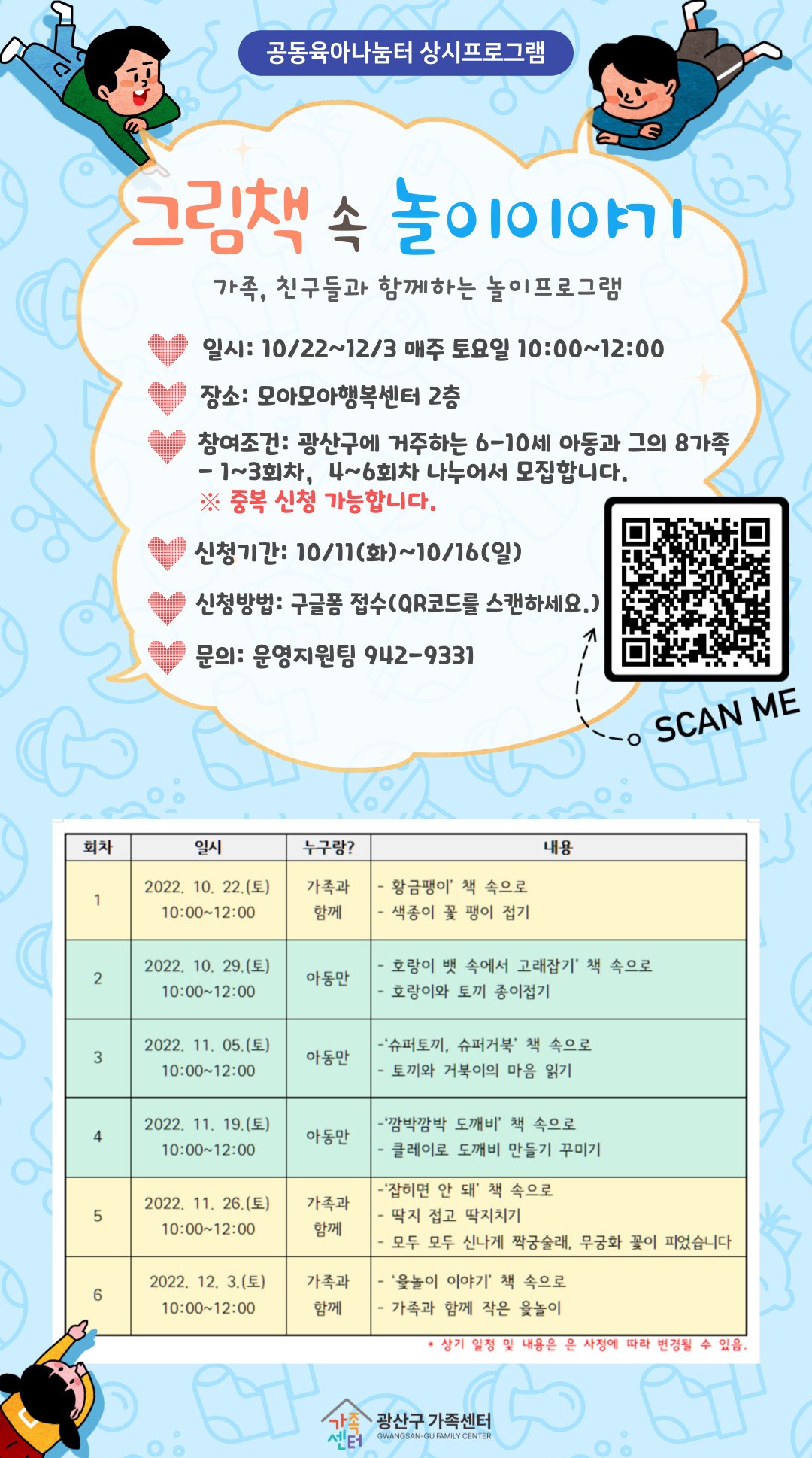 home 맘편한 내★일, 광주아이키움2.0 결혼·임신·출생 영유아 초·중·고 다양한 가족 일생활균형 커뮤니티 아동돌봄지원 소통방 나눔방 광주 아이키움 상담방 돌봄정보방 성폭력 피해 상담 및 사건지원 공지사항 우리동네 돌봄정보 기관별 공지사항 광산구가족센터 공동육아나눔터 상시프로그램 "그림책 속 놀이이야기" 등록일 : 2022-10-12 09:37 작성자 : 광산구가족센터 조회수 : 175 첨부파일 수정1.jpg 다운로드 목록
